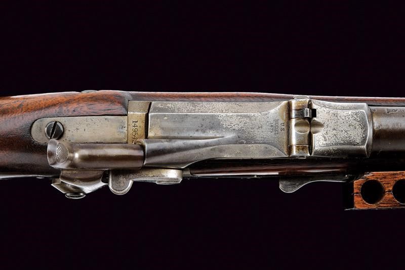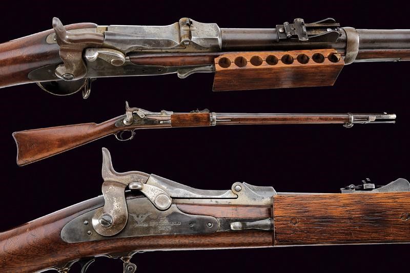 1873 Canna tonda, rigata (anima molto pulita, rigatura ancora visibile), con alzo di precisione, mirino e punzoni alla base, otturatore marcato 'US MODEL 1873', cal. 45/70; matricola '149xxx'. Batteria a molla in avanti marcata 'US SPRINGFIELD 1873' e con aquila americana. Cassa intera in legno, con rosetta incisa sulla pala e fornimenti in ferro. Completo di bacchetta e della rara cartucciera sperimentale Metcalfe, in legno, per otto pallottole.