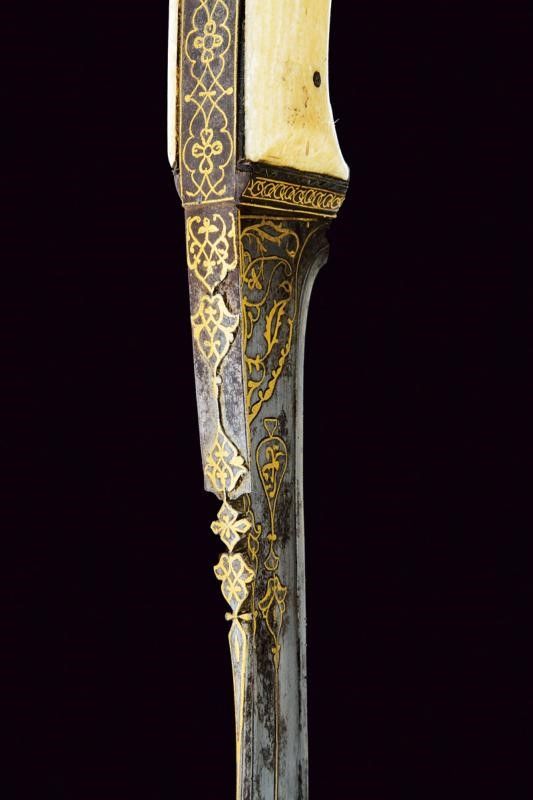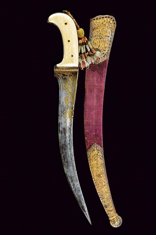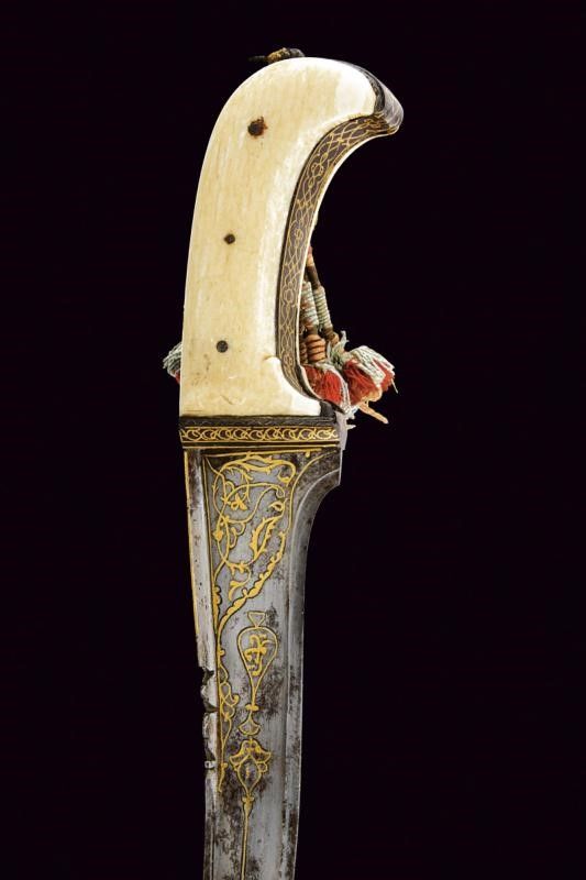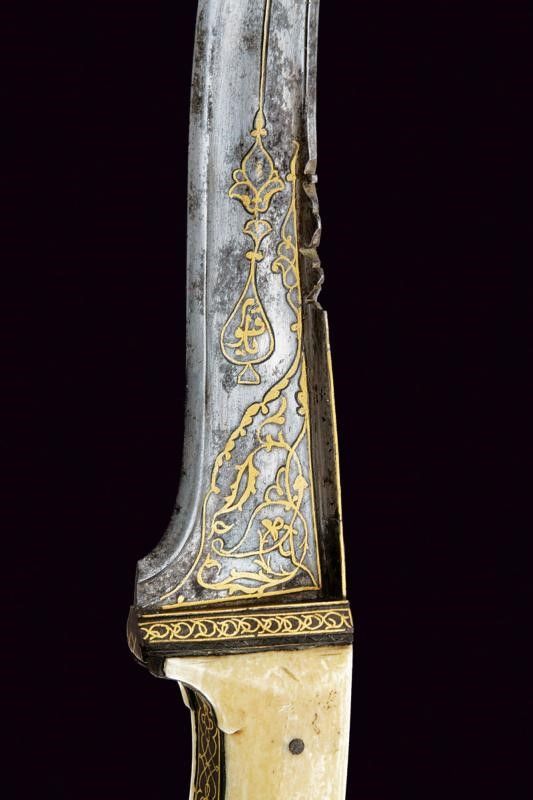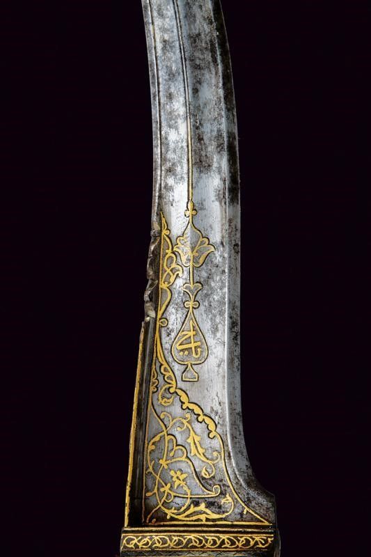 Indopersia, lunghezza 47 cm. fine del XVIII Sec. Lunga lama curva a un filo, in damasco (poco visibile), con punta rinforzata e largo dorso a 'T' con intagli dorati. La base ageminata in oro a motivi floreali e con un cartiglio su ogni lato con iscrizione in caratteri arabi. Fornimento in ferro con cornice decorata in oro, belle guancette in zanna di tricheco (piccolo restauro). Al pomo anello con nappa. Fodero in legno rivestito di velluto bordeaux (completamente liso) con fornimenti in metallo sbalzati a motivi floreali su fondo granulato. Raro.
