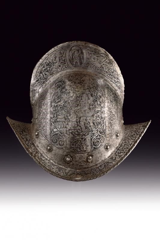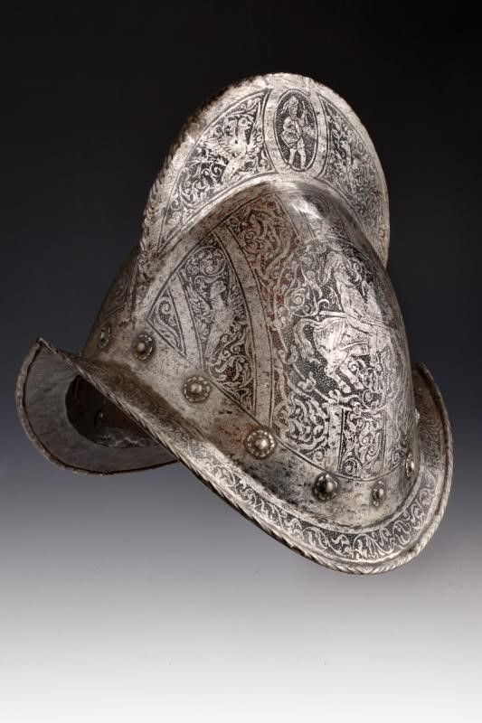 Germania del Sud, altezza 28.5 cm. 1600 circa Coppo in ferro lavorato in un solo pezzo con la tesa. Al sommo con cresta di media altezza con bordo lavorato a fingere il tortiglione, la tesa spiovente appuntita e costolata con margine orlato e anch'esso lavorato a fingere il tortiglione. Tutta la superficie finemente incisa; su un lato raffigurazione della scena biblica del 'Sacrificio di Isacco' entro una cornice circolare circondata da effigi di volatili e disegni floreali su fondo granulato, sull'altro lato ritratto un lanciere a cavallo decorato en suite. La cresta con raffigurazione di un tamburino e di un alfiere, entrambi entro un ellisse posta fra effigi di uccelli. La tesa ornata a motivi floreali. Base con giro di rivetti muniti di rosetta in ferro (piccole mancanze). All'interno sfogliature e resti di coietti.