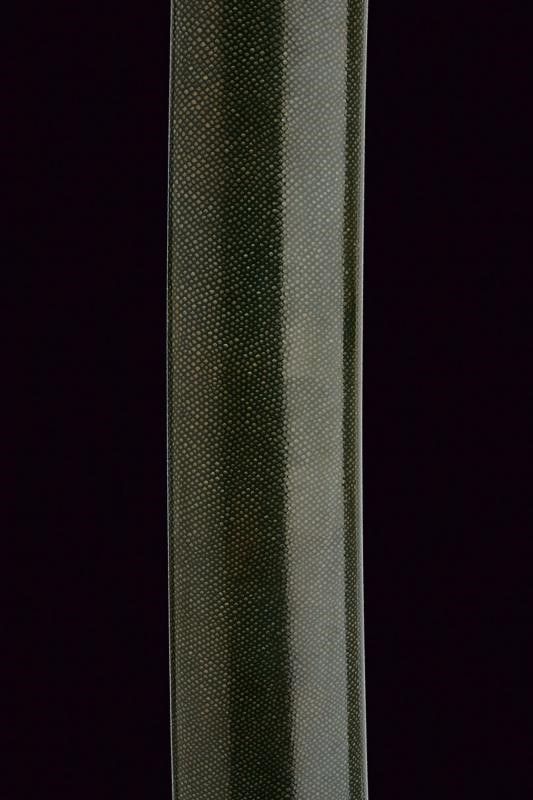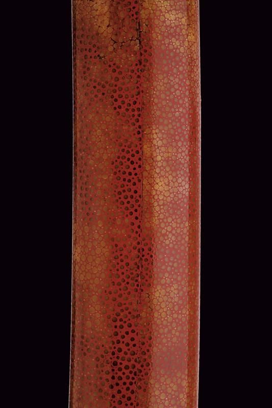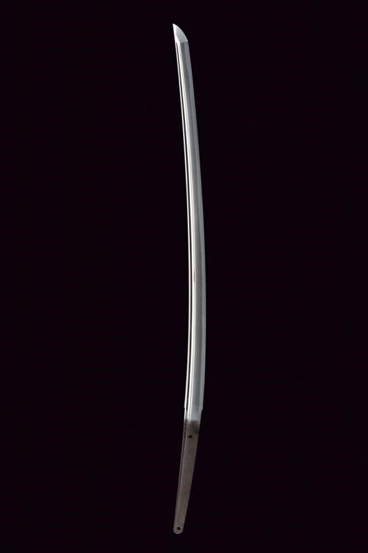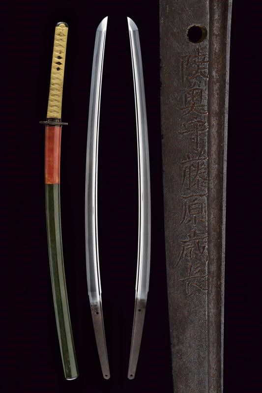 Giappone, lunghezza 99.8 cm. fine del XVII Sec. Lama con Nagasa di 70 cm. Hada: Itame Nagare Masame, Hamon: Suguha, scanalatura dorsale su tutta la lunghezza. Doppio Habaki in shakudo rivestito con lamina d'argento dorato. Nakago-mei: Mutsu no Kami Juji Wara Toshi Naga. Due mekugi-ana, la scanalatura prosegue anche per tutta la lunghezza del nakago. Bel koshirae con tsuba in ferro intagliato e traforato con un drago. Fuchi-kashira in ferro, decorati a motivi floreali in oro ed argento. Completa di menuki. Tsuka-ito in seta color beige. Saya in legno rivestita con pelle di razza e laccata color verde e rosso. Kogai-mei in shakudo decorato con volatili e alberi in oro, argento e rame su fondo nero.