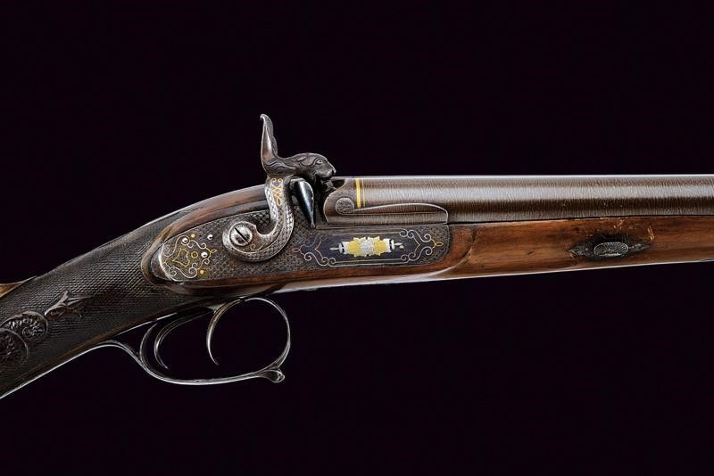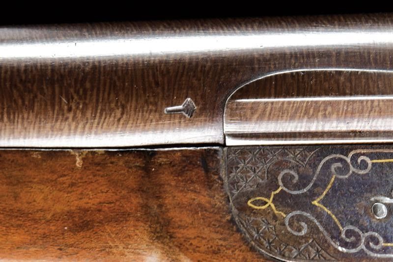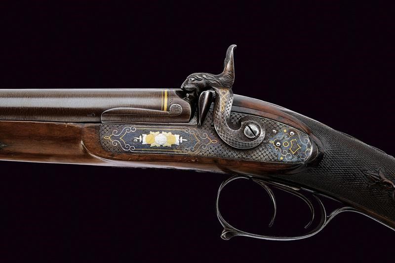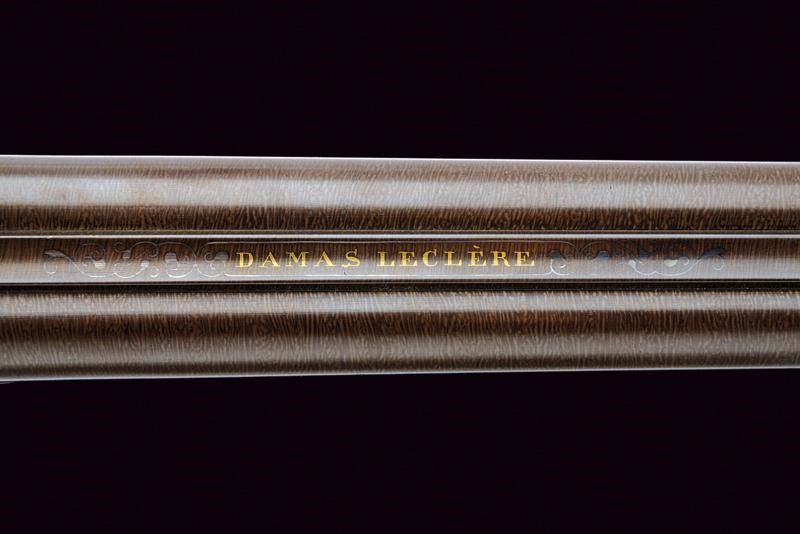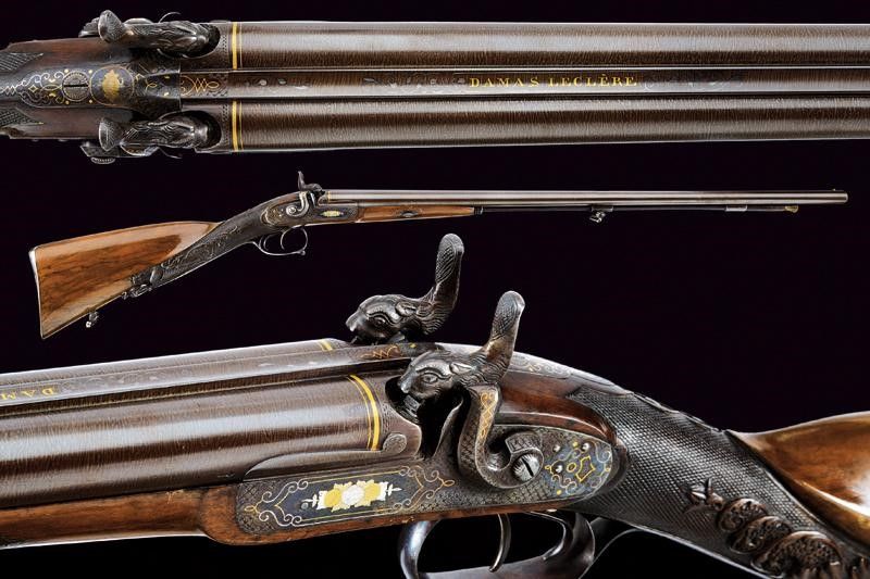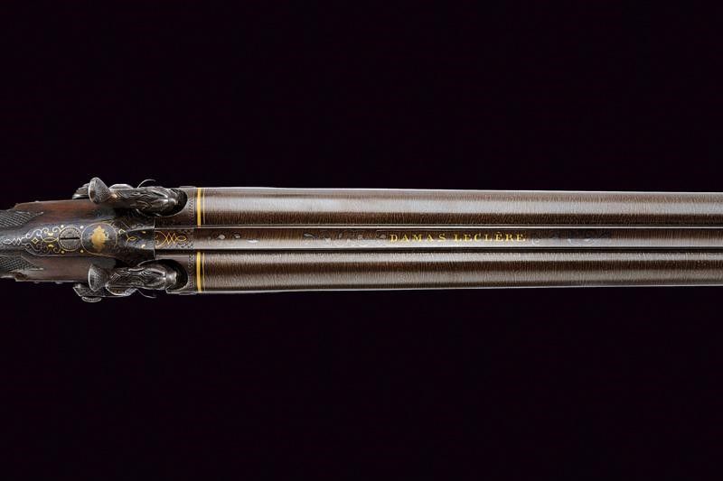 Belgio, lunghezza 115 cm. Canne tonde lisce, in damasco e brunite, con base recante anellature dorate, bindella dotata di firma 'DAMAS LECLERE' rimessa in oro fra disegni floreali in argento. Il lato inferiore delle canne con punzone del banco di prova di Liegi, iscrizione 'BREVETE' e 'LECLERE' e altri punzoni. Mirino in ottone, cal. 17 mm. in volata. Codolo inciso a motivi geometrici rimessi in oro e argento su fondo brunito. Belle batterie a luminello a molla in avanti, cartelle incise a micro-stelle con codetta e segmento anteriore incisi a motivi floreali. Cani con la stessa trama micro-stellata, inserti geometrici in oro e percussori lavorati a delfino. Bella cassa in legno con collo zigrinato e finemente scolpito a drago. Fornimenti in ferro brunito; il ponticello lavorato con agemine in argento e oro a motivi floreali e geometrici. Il poggiaguancia con patchbox. Bacchetta in legno con battipalla in ottone e cavastracci in ferro.