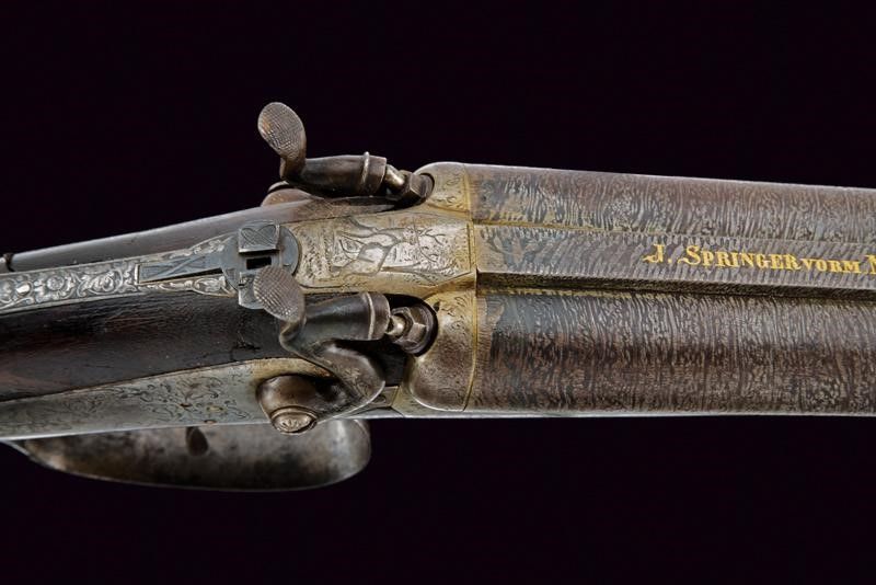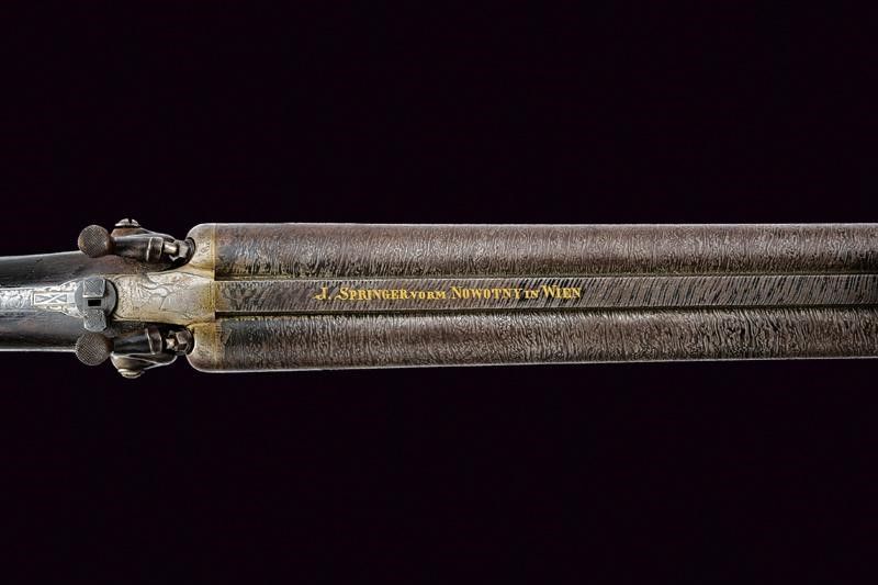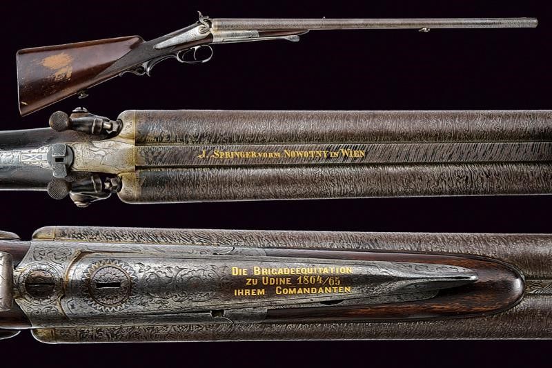 Vienna, lunghezza 104 cm. Canne tonde rigate (anime pulite, rigatura ben visibile), in fine damasco, con bindella firmata in oro 'J. SPRINGER VORM NOWOTNY IN WIEN' e dotata di alzo e mirino, cal. 15 mm. Lunga codetta incisa con cervo e a motivi floreali, munita di diottra abbattibile e recante piccolo scudetto ovale in argento. Batterie a molla indietro firmate 'SPRINGER ' e 'IN WIEN', incise finemente a temi venatori e a motivi floreali. Calcio (abrasioni, restauro attorno alla codetta) e astina in legno con collo zigrinato e fornimenti in ferro decorati en suite. La leva marcata in oro 'DIE BRIGADEEQUITATION ZU UDINE 1864/65 IHREM COMANDANTEN'. Matricola '23xx'. Grilletti con sensibilizzatore.
