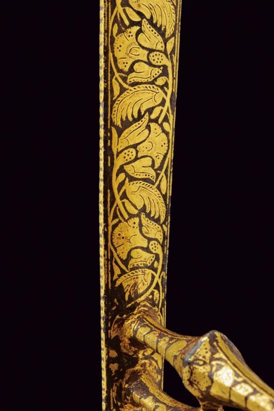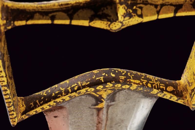India, lunghezza 40.4 cm. Metà del XIX Secolo Snella lama in dritta in damasco, di forma triangolare a due fili e doppia scanalatura, nervata al centro, con punta rinforzata e costolata in mezzeria, dotata di base con fiore dorato. Fornimento di tipica foggia, i due traversini uniti al centro; tutta la superficie decorata in oro con eleganti disegni a motivi floreali e geometrici, la base dell'impugnatura con iscrizioni (piccole mancanze alle agemine). Fodero in legno ricoperto con tessuto policromo.
