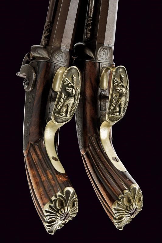 Canne lisce, ottagonali, con struttura di damasco e mirino, cal. 12 mm; codette incise a motivi floreali. Batterie a molla indietro firmate 'Legnani' e 'Milano' ed incise a motivi floreali. Calci in legno scanalato, ponticelli in alpacca decorati con un segugio fra fiorami in rilievo, le cocce a motivi floreali. Bacchette montate lateralmente, in legno, con battipalla in ottone e cavastracci in ferro.