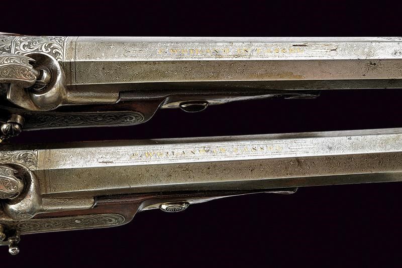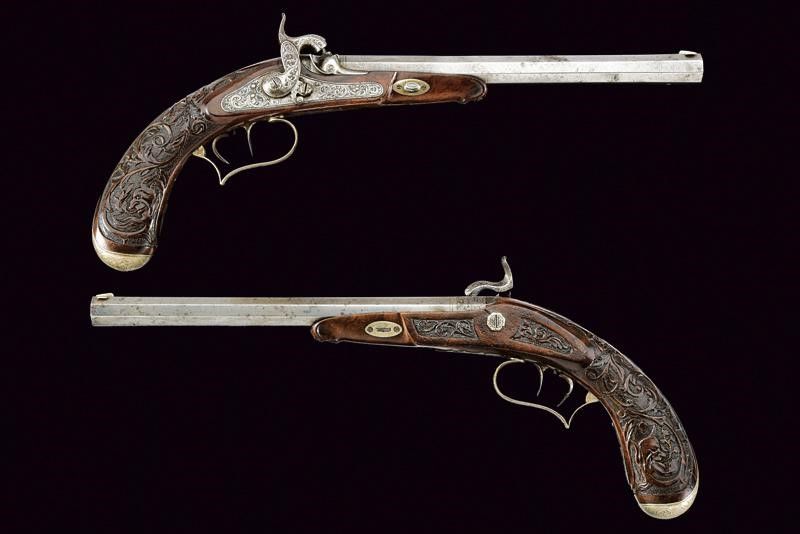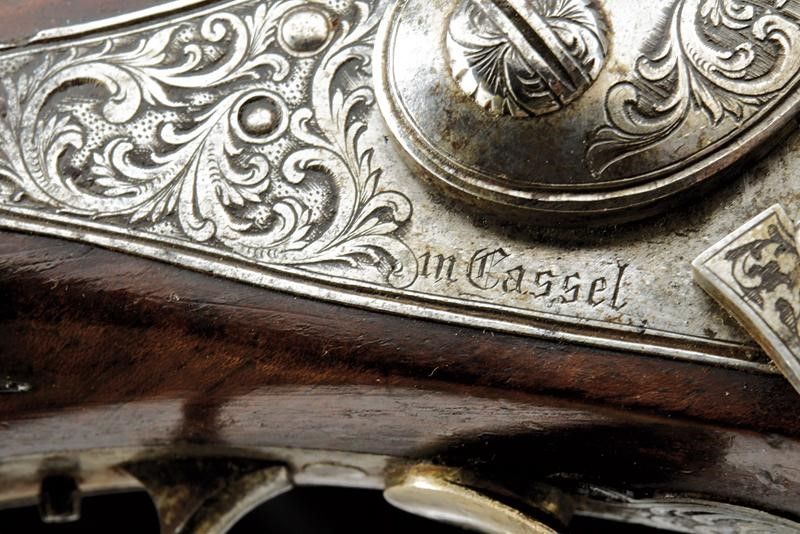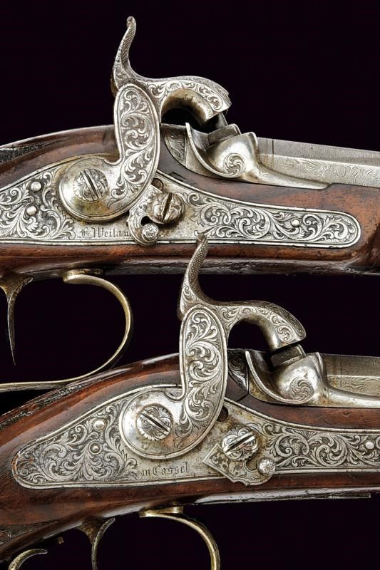 Canne rigate (anima da pulire, rigatura visibile), ottagonali, in damasco firmate 'F. WEILAND IN CASSEL' in oro, con cornice in argento, dotate di culatta incisa, mirino, cal. 10 mm; codette incise e munite di traguardo. Batterie a molla in avanti firmate 'F. Weiland' e 'in Cassel', incise a motivi floreali, dotate di sicura. Mezze casse in legno con muso scolpito a mascherone, calco a motivi floreali in bassorilievo. Fornimenti in metallo giallo decorati en suite. Stecher. Coppia da cassetta, quindi prive di alloggiamento per bacchetta. Meccanica funzionante, un stecher da regolare.