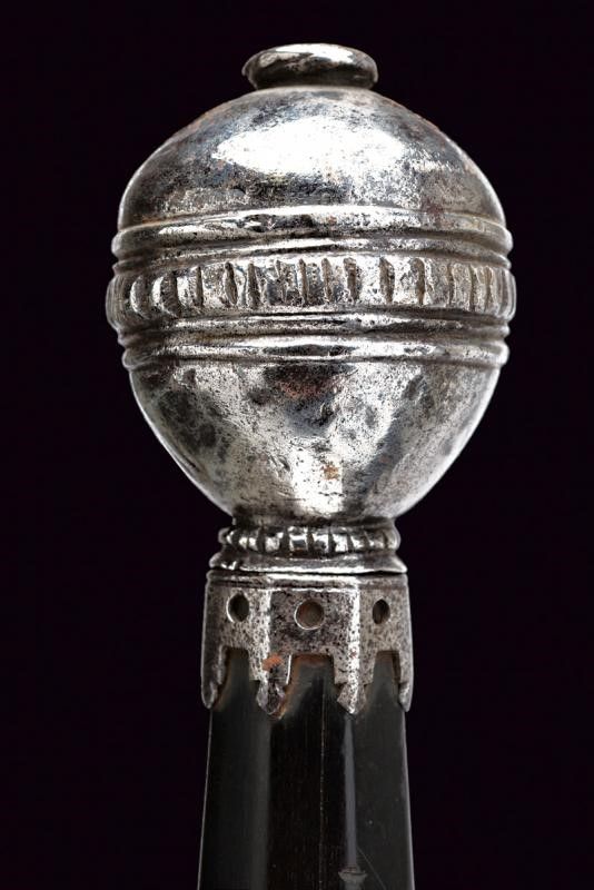 Italia, lunghezza 124.5 cm. XVI - XIX Secolo Lama dritta a due fili, costolata in mezzeria, dotata di tallone (XIX secolo). Bel fornimento in ferro con elso a bracci fortemente incurvati, quasi a formare cerchi, muniti di testa sferoide bottonata. Il pomo lavorato en suite. Impugnatura in ebano faccettato priva di trecciola, dotata alle estremità di ghiere traforate e con bordo festonato.