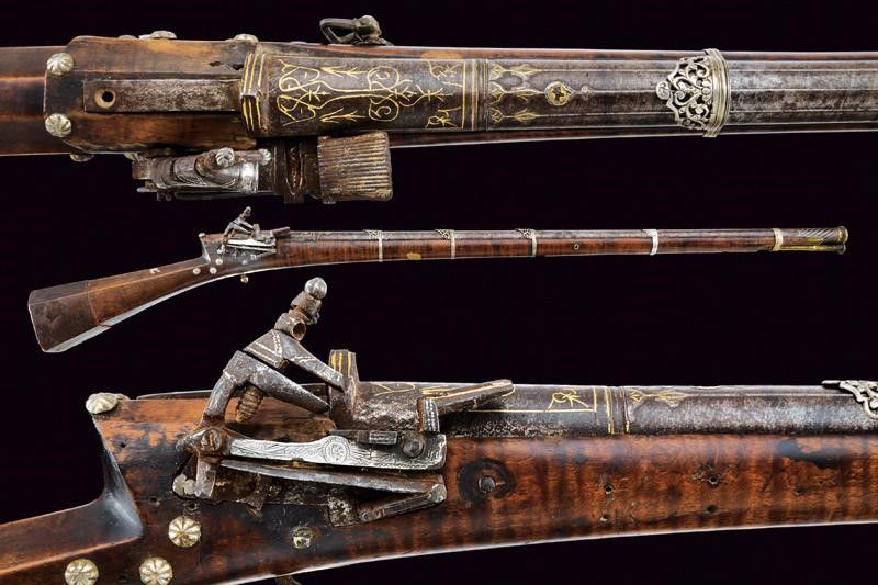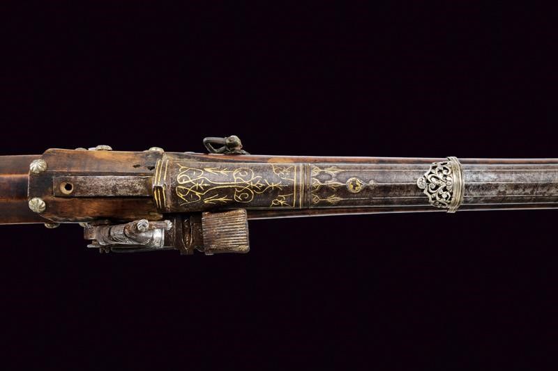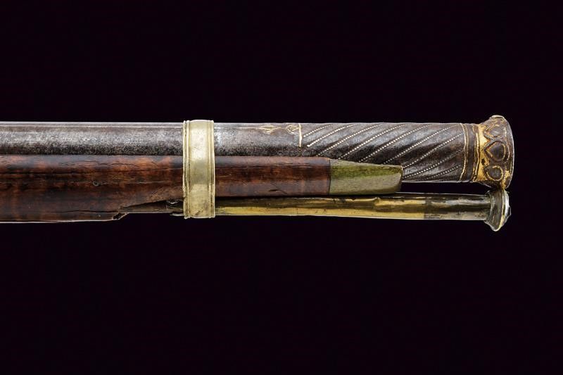 Prima metà del XIX Secolo Bella ed interessante canna liscia in damasco a tre ordini con traguardo alla base; la prima parte tonda, decorata con agemine in oro, la parte centrale con punzone rimesso in oro (mancanze) e decorata con sottili nervature, le estremità di questa sezione intagliate a fiori. L'ultimo segmento della canna intagliato a spire ornate con linee perlinate rimesse in argento; la volata con gioia di bocca intagliata, recante resti di doratura e munita di mirino, cal. 17.5 mm. Codetta liscia, vite mancante. Batteria a pietra focaia recante decorazioni ed agemine in argento e con punzone arabo. Cassa intera in legno con calcio faccettato e lavorato in due pezzi, al di sotto della batteria una tarsia in osso. Rivetti, grilletto e reggicanna in argento. I primi tre reggicanna inoltre finemente traforati a motivi floreali, gli ultimi due lisci e probabilmente di epoca successiva. Bacchetta in ferro con battipalla in argento. Difetti e mancanze generali.