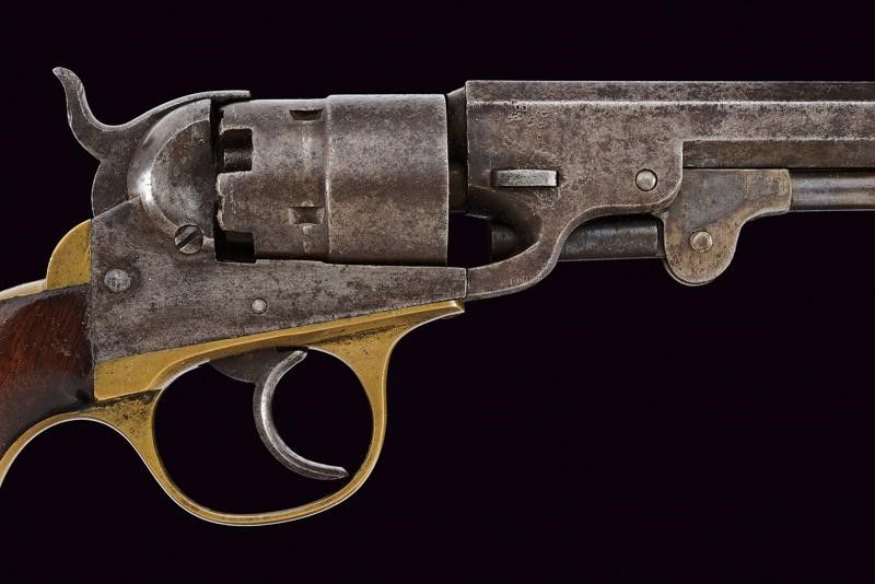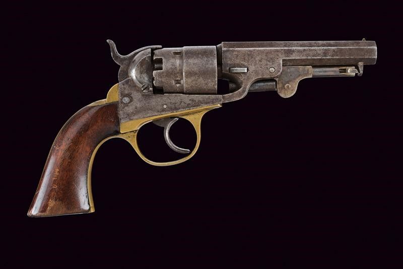 USA, lunghezza 22,5 cm. 1864 - 1869 Canna ottagonale rigata (interno da pulire, rigatura visibile), da 5', con mirino a cuspide in ottone e marcatura della ditta al dorso con brevetti, cal. 36. Tamburo a cinque colpi, con coda ribassata e matricola coeva al castello. Meccanica funzionante. Impugnatura in noce. Bande in ottone, sul fondo la matricola '84xx'. Qualche intaccatura. Alcuni piccoli punti con lievi tracce di finitura. Secondo modello.