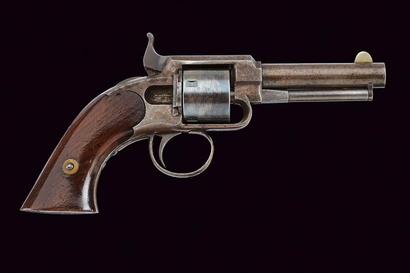 1860-70 Canna tonda rigata con mirino a vela in metallo bianco da 3' (anima pulita, rigatura visibile), cal. 30 rimfire. Tamburo liscio a cinque colpi. Meccanica funzionante. Guancette in noce. Resti di brunitura antica.