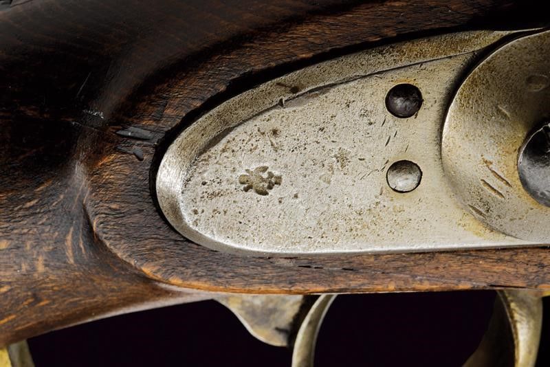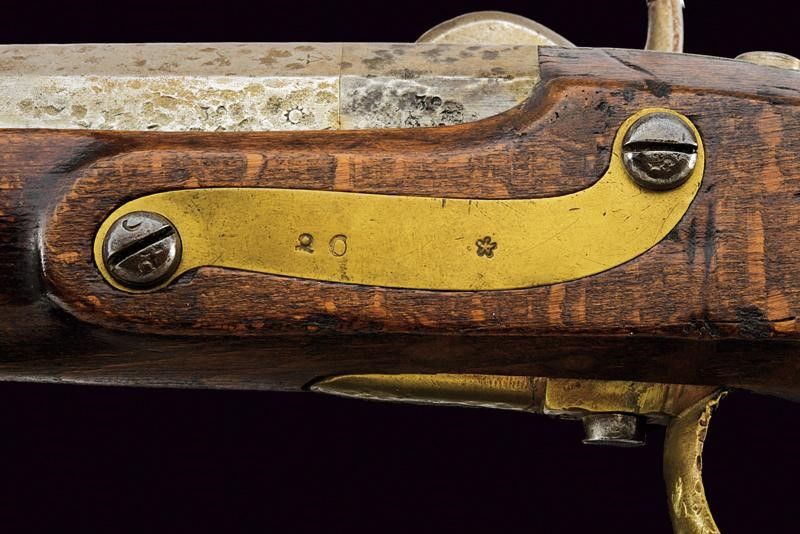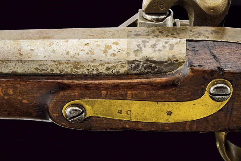 Canna tonda rigata, con culatta ottagonale (all'interno un po' di pitting soprattutto in volata, rigatura ben marcata per tutta la lunghezza), dotata di mirino e dente d'innesto per baionetta, con alzo a fogliette abbattibili, resti di punzoni quali 'V', '4' e un sole. Cal. 18,1 mm. in volata. Batteria con sistema Augustin, cartella datata '847' e recante punzone imperiale. Meccanica ben funzionante. Cassa intera in legno (rottura del collo ben restaurata in epoca d'uso) con resti di timbri. Fornimenti in ottone. Varie viti con punzoni '20'. Bocchino con gancio per baionetta. Bacchetta in ferro con battipalla munito di sforatura. Pala con patchbox (manca il dente di fissaggio). Con baionetta 'Haubajonett', lunghezza 72 [cm], recante marcature al collo '.F' 'W' e altri timbri.