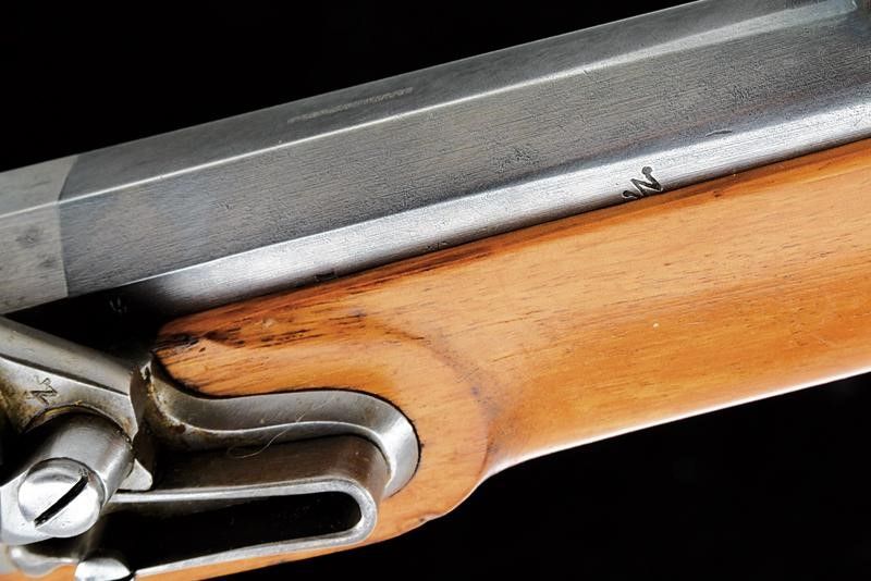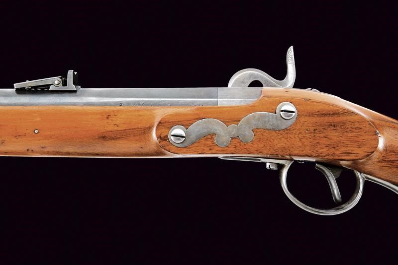 Austria, lunghezza 112.5 cm. Canna tonda con base ottagonale con bindella, l'anima dotata di dodici rigature, base marcata 'FERD. FRUWIRTH', alzo abbattibile con range da 150 a 700 piedi (circa 112 - 525 mm), mirino, cal. 18.1 mm. Batteria con sistema Augustin datata '852' e con punzone imperiale. Cassa intera in bel legno chiaro, sotto il calcio marcatura 'F.F. 1852'. Fornimenti e bacchetta originale in ferro. Molto raro.