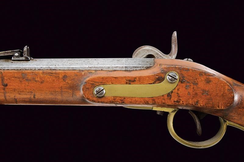 Canna rigata, a due ordini, tonda e ottagonale, con base marcata 'CP' e 'R', dotata di mirino, alzo abbattibile, dente d'innesto per baionetta, cal. 18 mm. Batteria con sistema Augustin e cartella datata '852' e con punzone imperiale. Cassa intera in legno con timbri 'K' e 'B', ponticello e coccia in ottone, reggicanna e bacchetta in ferro. Completa della sua baionetta con punzoni poco leggibili, lunghezza: 71.4 [cm]
