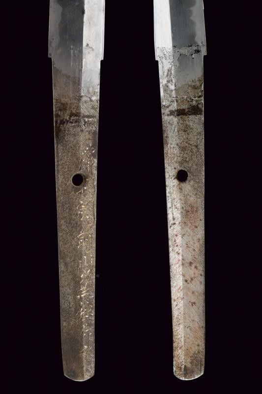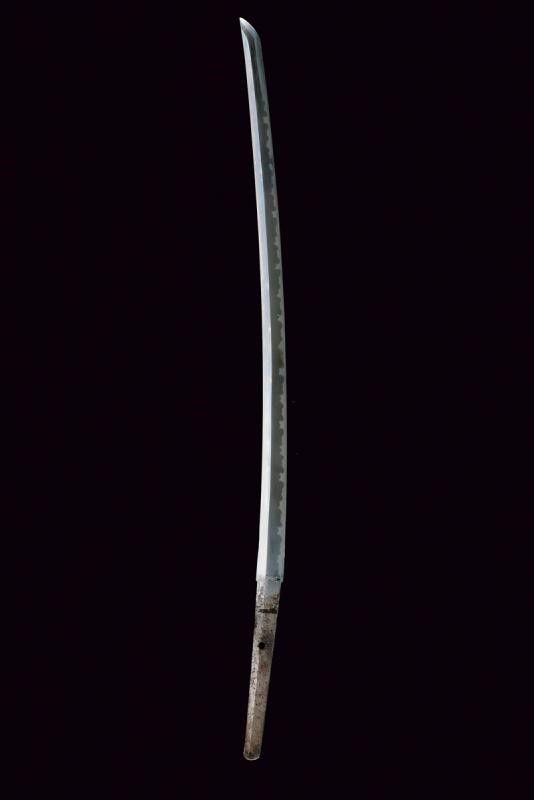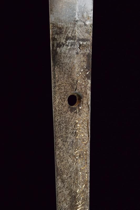 Giappone, lunghezza 92.4 cm. Periodo Showa (1926-1989) Nagasa (65.7 cm), hamon e hada visibili; habaki in ottone con resti di argentatura. Nakago mei 'Noshu Seki Maekawa Kane Tsugu Saku Kore', con un mekugi-ana. Koshirae con bella tsuba, fuchi-kashira di fattura semplice e fini menuki. Tsuka-ito in seta verde. Saya in legno laccato nero. Manca il perno del mekugi-ana. La lama Showa, 1930 circa, il koshirae del tardo Periodo Edo.