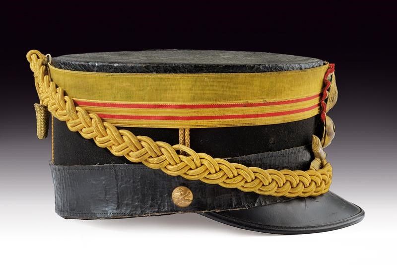 Regno d'Italia, altezza 12 cm. inizio del XX Sec. Fusto rigido rivestito di panno turchino, coccarda tricolore, fregio in ottone stampato con cannoni e granata a fiamma dritta. Bel cordone in tubolare sempre dorato. Interno con alluda in marocchino nero e cuffia in cotone plissettato.