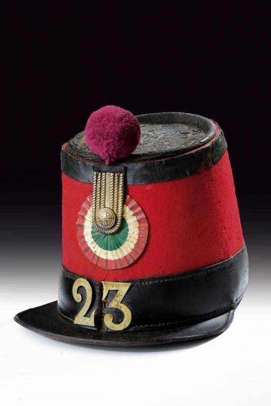 Regno d'Italia, altezza 16 cm. 1860 Fusto in cuoio ricoperto da panno scarlatto, cappio e numero ' 23' in metallo argentato, nappina tonda in lana, coccarda metallica tricolore. Interno della visiera dipinto in verde, alluda in coietto nero, completo di soggolo originale in cuoio. Esemplare raro in buone condizioni.