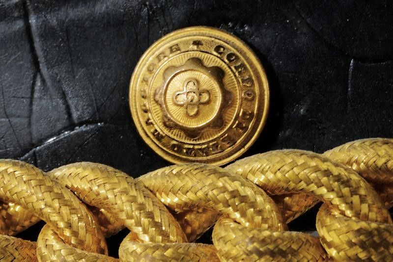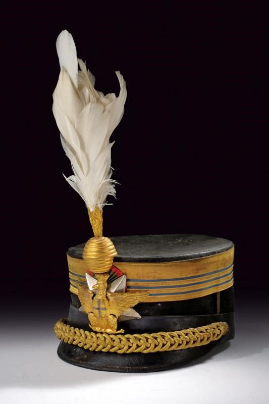 1890 - 1910 Corpo rivestito in panno nero con gradi in gallone dorato, tutti gli effetti presenti, incluso il pennacchio, breve visiera in cuoio. L'interno con alluda in pelle senza cuffia. Molto raro.