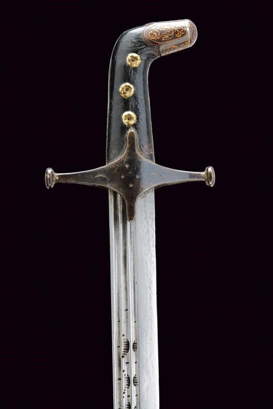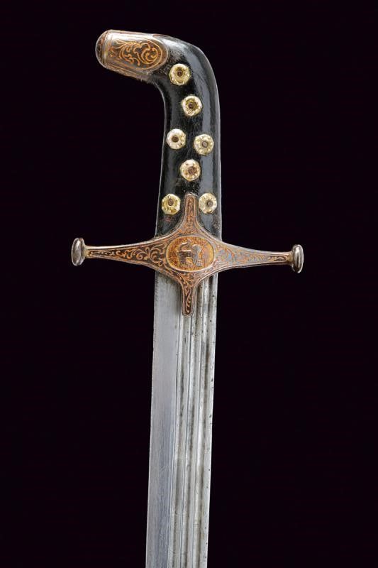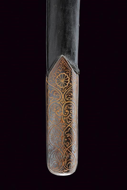 Impero Ottomano, lunghezza 91 cm. Prima metà del XIX Secolo Lama di media larghezza, leggermente curva, a un filo e controfilo e con triplice scanalatura sotto al dorso. Sul lato di quarta alcune incisioni dentate alla base. Fornimenti in ferro con elso a croce inciso e dorato (finitura rinfrescata) con una tigre fra decori floreali; il pomo angolato inciso a fiorame. Impugnatura rivestita di cuoio con rivetti in ottone decorati con puntini in argento. Fodero in legno rivestito di cuoio (di restauro, moderno) con fornimenti in ferro decorati en suite. Due anelli di sospensione.
