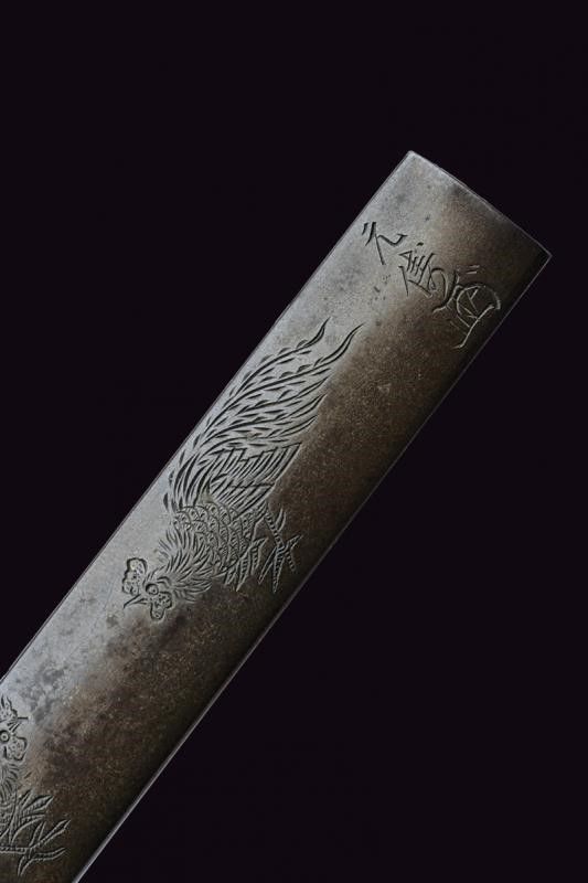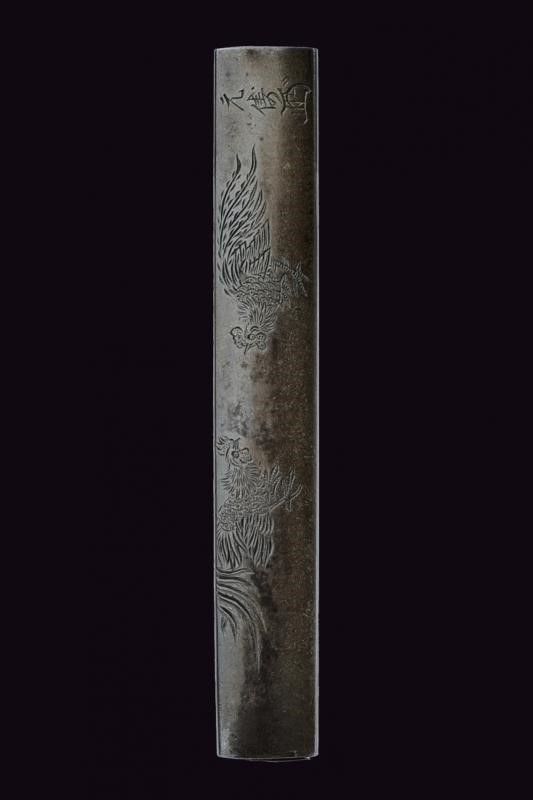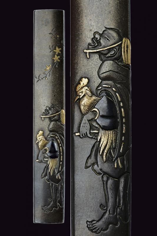Giappone, lunghezza 9.7 cm. Periodo Edo (1603-1867) In shibuichi, finemente lavorato con decorazioni in shakudo e oro, i dettagli lavorati a cesello. Sulla parte anteriore raffigurato un saggio con un gallo nella mano intento ad osservare le stelle sotto i rami di un albero. Sul retro presenti decorazioni cesellate raffiguranti due galli e la firma. Periodo Edo, 1800 circa. In kiri-box.