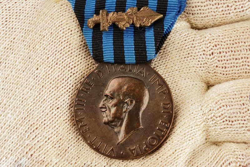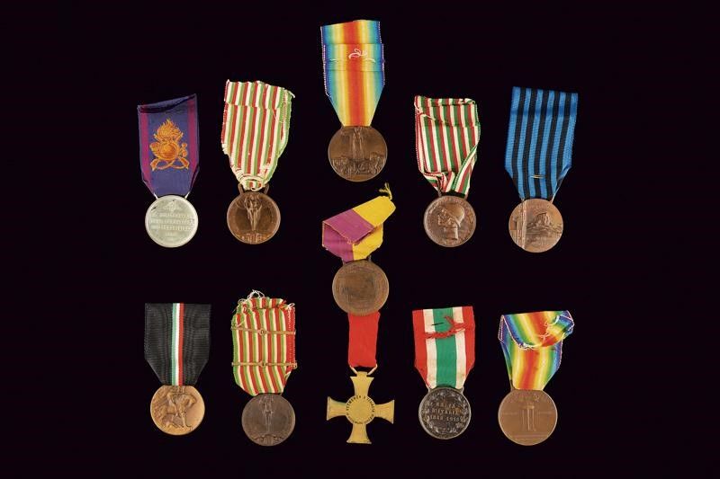Fine XIX inizio XX Secolo 'Alessandro Lamarmora / 50° Anniversario della fondazione dei Bersaglieri 1886' bronzo argentato, con nastrino coevo. Croce Commemorativa 11a Armata, in bronzo dorato e smalti con nastrino. Medaglia commemorativa delle operazioni militari in Africa Orientale, in bronzo con nastrino completo di gladio. Medaglia per la Campagna fascista 1919-1922 in bronzo, con nastrino. Medaglia commemorativa della Marcia su Roma. La medaglia commemorativa della guerra italo-austriaca 1915-1918, tre esemplari tutti con nastrino, uno completo di barrette metalliche. Medaglia per l'Unità d'Italia 1848-1918, in bronzo, con nastrino. Medaglia Interalleata per la Vittoria; due esemplari entrambi con nastrino.