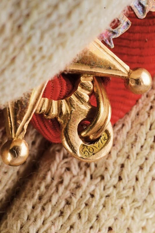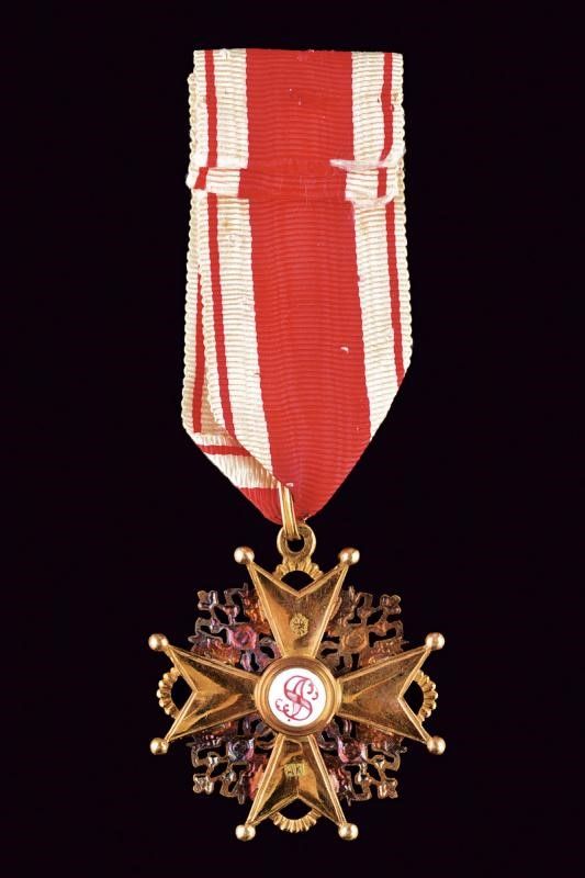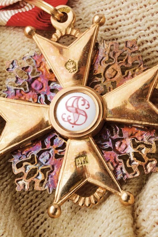 1900 circa Croce da cavaliere in oro e smalti con punzone 'AK', aquila imperiale e sull'anello marcatura '56'. Su nastro.