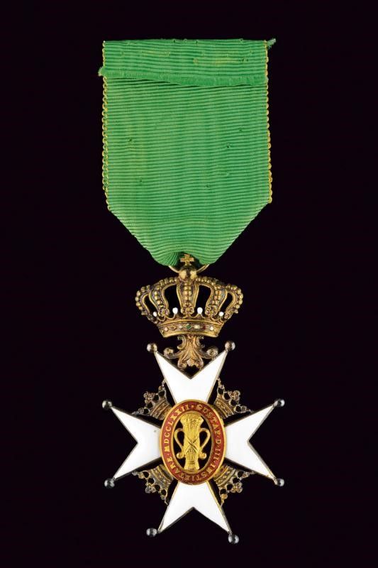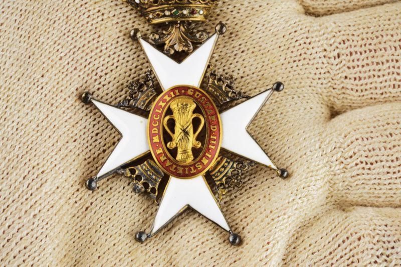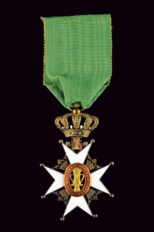 1900 circa Croce da cavaliere in bronzo smaltato, il medaglione al centro in oro con smalti. Su nastro originale. In scatola originale con timbro di un gioielliere di Stoccolma.