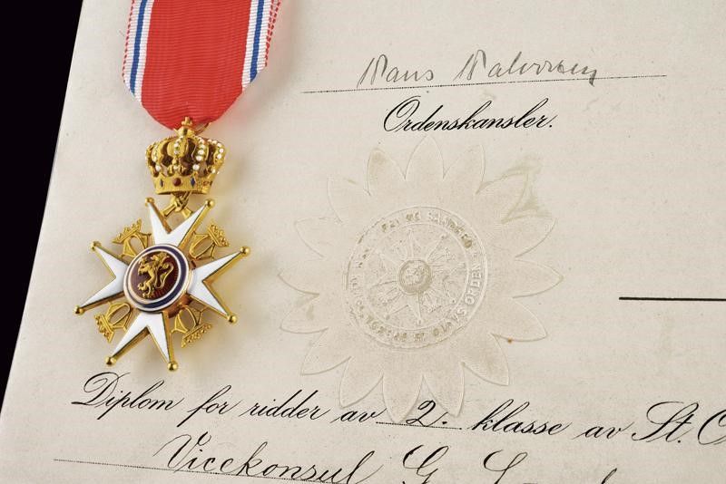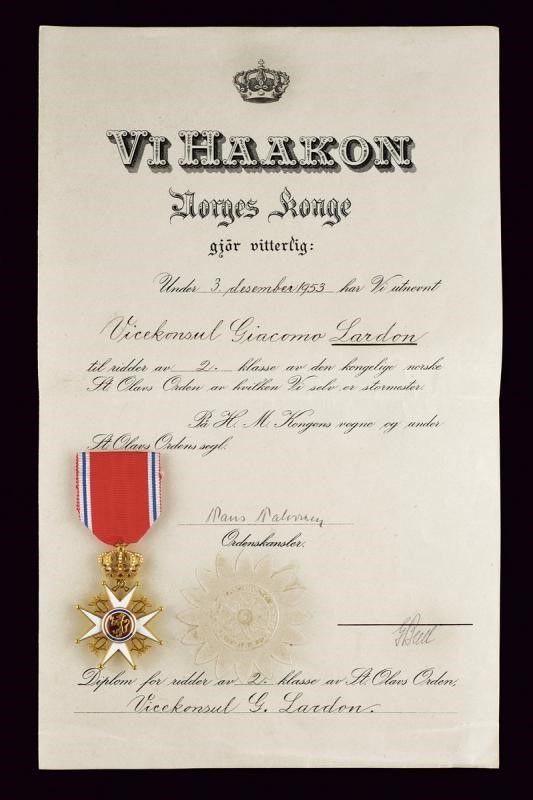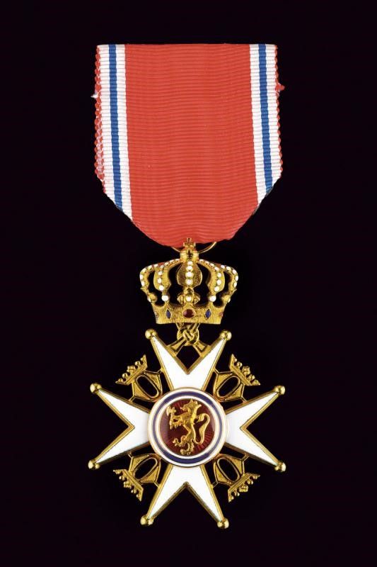 Norvegia, dimensioni 4.1 x 6 cm. 1953 Croce da cavaliere di seconda classe, in oro e smalti. Su nastro; in astuccio originale marcato 'TOSTRUP 1832' e con nome dell'ordine sul coperchio. Insieme con il documento originale di conferimento e la lettera di consegna.