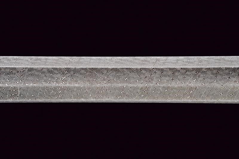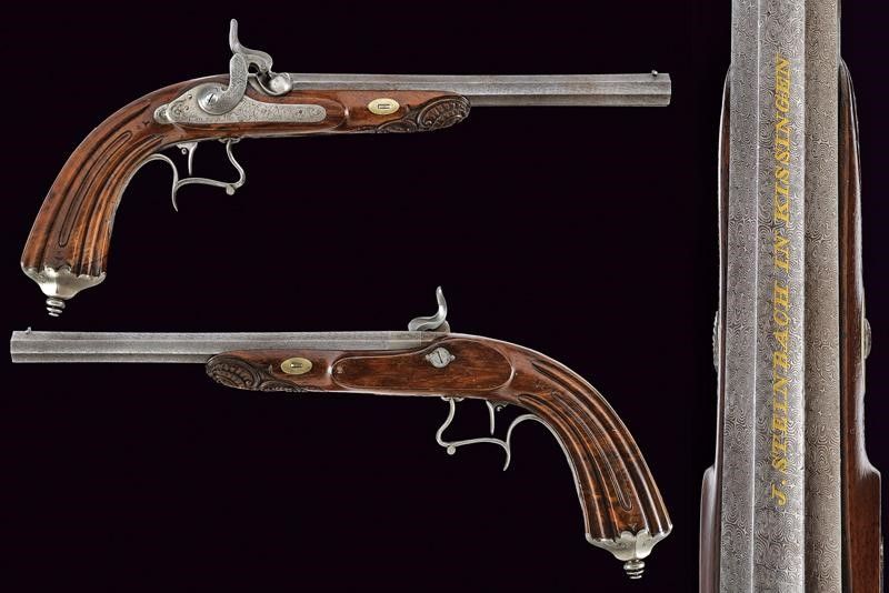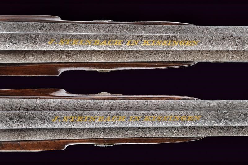 Bellissime canne rigate (anime pulite, rigatura ben visibile) ottagonali, in fine damasco, a faccette scanalate, firmate 'J. STEINBACH IN KISSINGEN' in oro, con culatte incise a motivi floreali e numerate '1' e '2', dotate di mirino di precisione, cal. 10 mm; codette incisa e munite di alzo regolabile. Batterie a molla in avanti finemente incise a motivi floreali. Mezze casse in legno con muso scolpito a rocaille in bassorilievo e con calcio scanalato. Fornimenti in ferro decorati en suite, ponticelli con poggiadito, grilletti con sensibilizzatore. Sotto alle batterie, sul lato inferiore delle casse, uno scudetto in argento con monogramma 'A' sormontato da corona comitale.