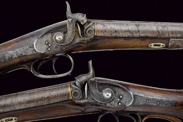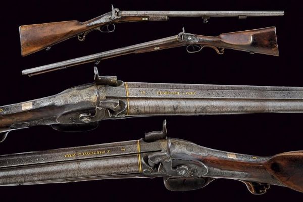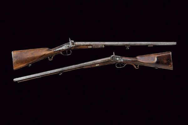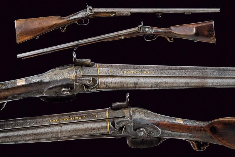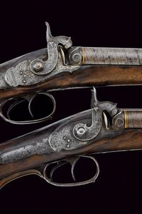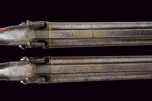Canne lisce (pulite, pitting), tonde, in fine damasco, con bindella marcata in oro 'F. BARTUSCH IN WIEN' e numerate '1' e '2', le culatte con incisioni di volatili e con cornice in oro; mirino, cal. 12. Lunghe codette finemente incise, numerate '1' e '2' e con scudetto in oro rosso recante monogramma sotto corona comitale. Le batterie a molla indietro firmate 'F.BARTUSCH' e 'IN WIEN' ed incise a motivi venatori e floreali. Mezze casse in legno con collo e astina zigrinati. Fornimenti decorati en suite, le prolunghe dei ponticelli in corno. Una con bacchetta in legno, l'altra mancante. Difetti e segni d'uso e del tempo. Una doppietta con restauri al collo e al muso.