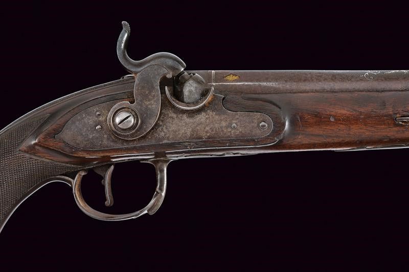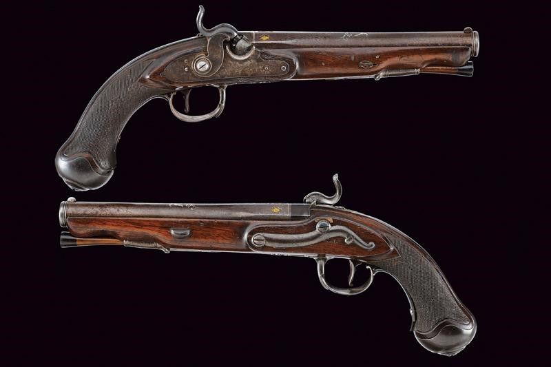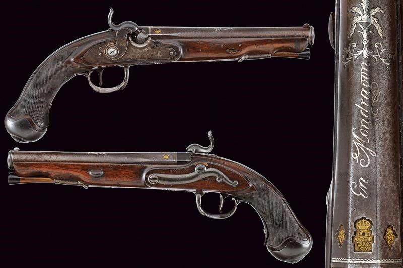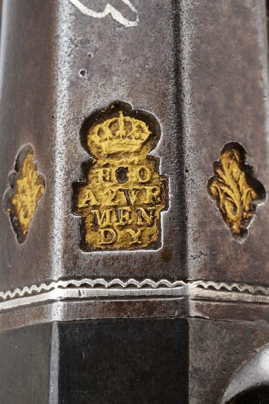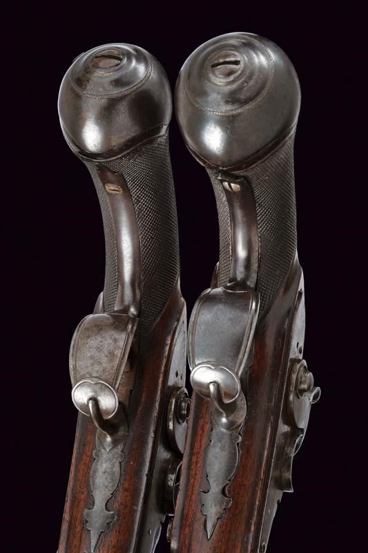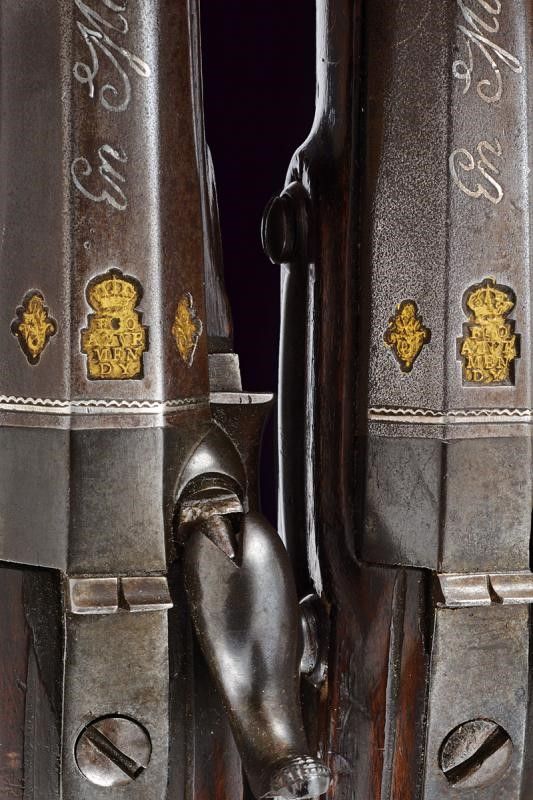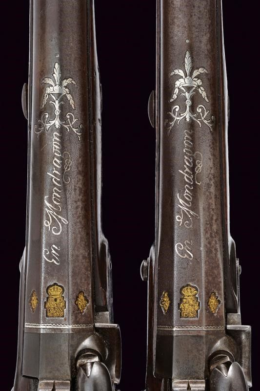 Spagna, lunghezza 36 cm. Canne lisce a due ordini, ottagonali nella prima parte, con punzone rimesso in oro sotto corona 'FCO / AZVR / MEN / DY' fra due fiori, in seguito marcate 'En Mondragon' in argento con decorazioni floreali, volate con gioia di bocca e mirino, cal. 17.4 mm. Codette lisce dotate di alzo, brunitura originale. Batterie a molla in avanti con cartella piatta e resti di brunitura. Casse intere in legno con collo micro-zigrinato, fornimenti lisci in ferro (uno dei due ponticelli probabilmente sostituito in epoca d'uso). Meccaniche funzionanti.