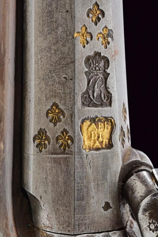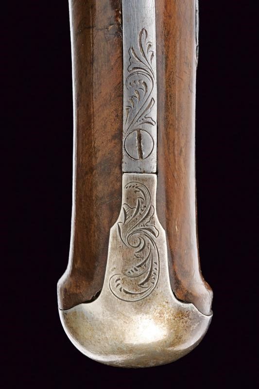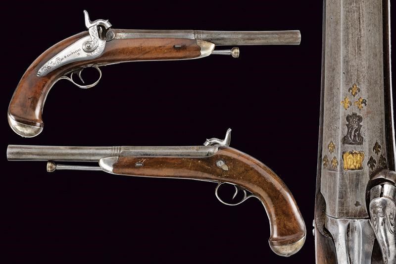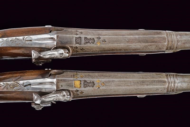Napoli, lunghezza 38.5 cm. Canne lisce a due ordini, prima ottagonali, con marchi della Real Fabbrica di Napoli, poi tonde, con anellature al cambio, calibro 15 mm; lunghissime codette incise a motivi floreali e dotate di traguardo. Batterie a molla in dietro firmate 'GIARLELLI' ed incise a motivi floreali. Mezze casse in legno con fornimenti lisci in argento parzialmente incisi. Bacchette in ferro con battipalla in argento e cavastracci.