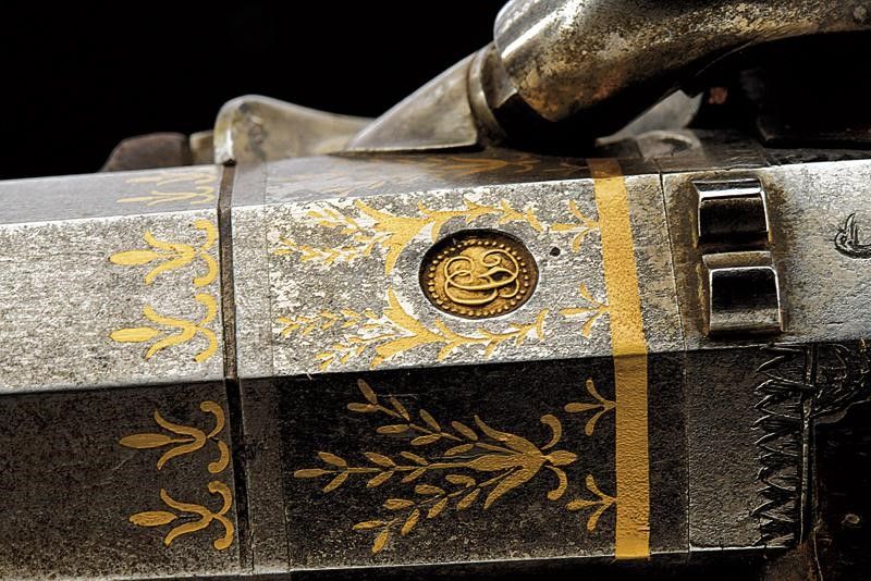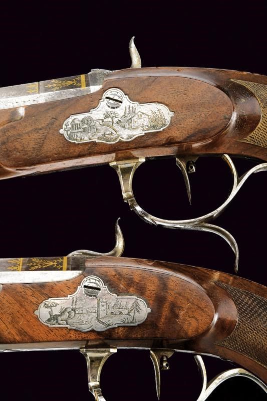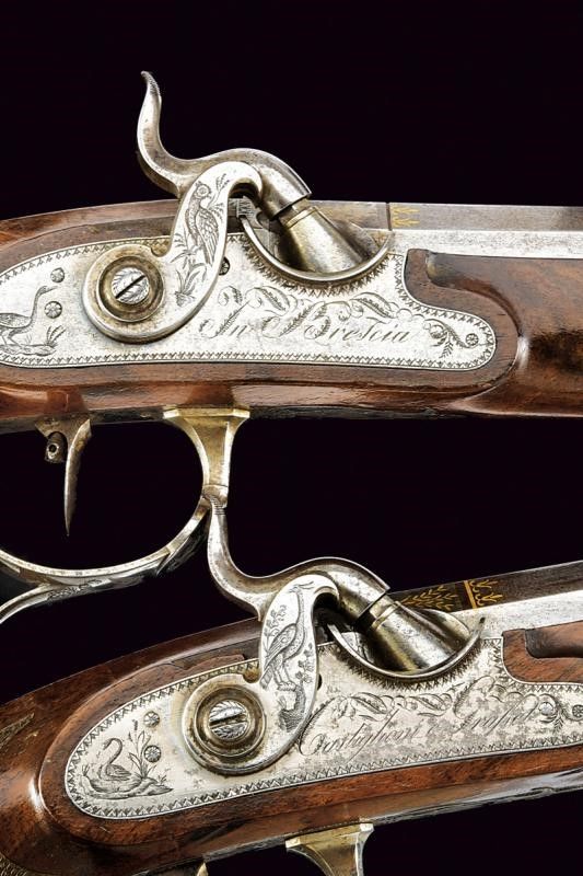 Canne microrigate, ottagonali, firmate in oro 'C. G. Brescia', con base recante marca 'CG' e decorazioni in oro, volata con mirino e decorazioni sempre in oro, cal. 14 mm; codette munite di alzo ed incise con un volatile e a motivi floreali. Batterie a molla in avanti firmate 'Castiglioni e Grasset' e 'In Brescia', incise con volatili e a motivi floreali e geometrici. Casse intere in legno con calcio zigrinato e cocce ottagonali. Fornimenti in acciaio con bellissime incisioni con animali, edifici, e fiorami. Ponticelli con poggiadito, grilletti con sensibilizzatore. Bacchette in legno con battipalla in ottone (un disco mancante) e cavastracci in ferro.