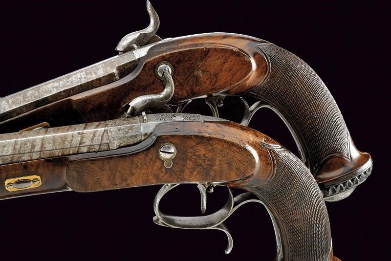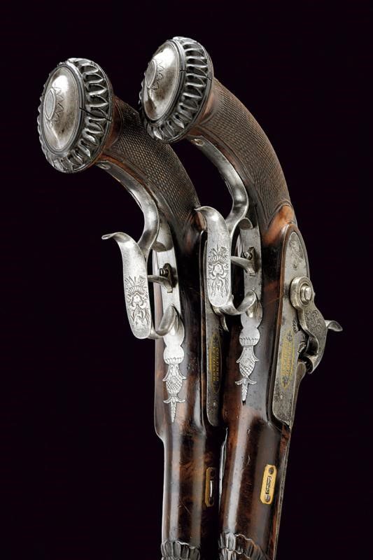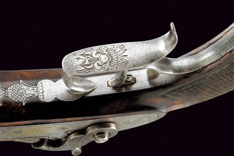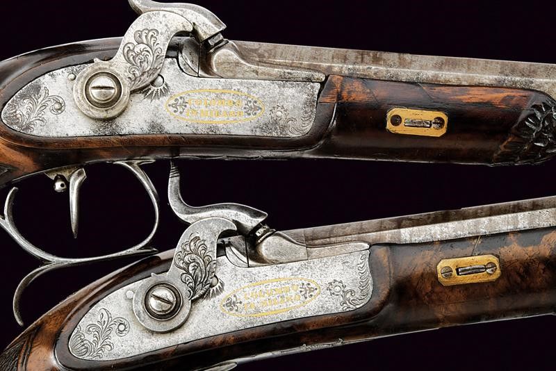 Canne rigate (anime pulite, rigature visibili) ottagonali, damascate, marcate '1' e '2', con mirino, cal. 12 mm. Batterie a molla in avanti firmate in oro 'COLOMBO IN MILANO' ed incise a motivi floreali. Codette incise e dotate di alzo. Mezze casse in legno (piccoli danni e restauri) con muso scolpito a conchiglia, calci zigrinati e cocce scolpite a fogliame. Fornimenti in ferro inciso, ponticelli con poggiadito, grilletti con sensibilizzatore. Da cassetta, quindi prive di alloggiamento per bacchette. Meccanica funzionante.