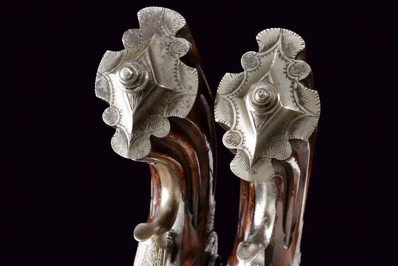 Liegi, lunghezza 41 cm. Canne ottagonali rigate firmate 'N VIVARIO PLOMDEUR ARQ.R DU ROI A LIEGE', con culatta incisa a fiorame, recanti su un lato il punzone del banco di prova di Liegi, munite di mirino, cal. 12 mm; codette incise a fiorami. Batterie a molla in avanti incise en suite. Casse in radica scolpite alla bocca a racemi e scanalate al calcio. Ponticelli con poggiadito in ferro, cocce cuspidate ed incise; stecher. Nella loro cassetta di legno foderata internamente di velluto rosa, munita di tutti gli attrezzi e della chiave.