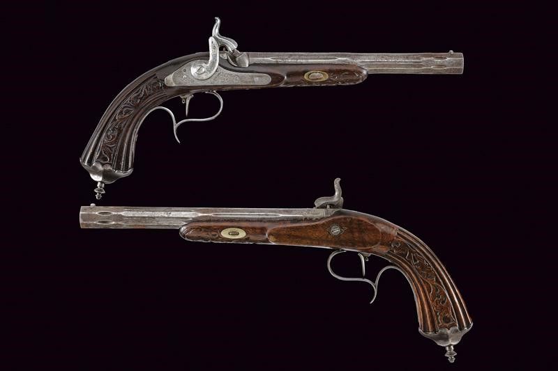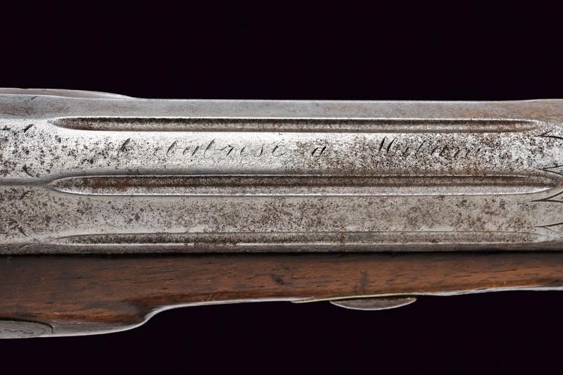 Canne ottagonali rigate (anima da pulire, rigatura visibile), strutturate a settori decorati a scanalature e incisioni, con resti di una firma, mirino di precisione, cal. 11.4 mm. Codette incise a motivi floreali e dotate di alzo. Batterie a luminello a molla in avanti, cartelle piatte ed ornate da incisioni a racemi, codoli ribassati. Mezze casse in legno con musi e calci scolpiti, i primi a motivi floreali e i secondi anche con scanalature. Fornimenti in ferro incisi en suite con le batterie, ponticelli con poggiadito, cocce prolungate con estremità a trottola. Grilletti con sensibilizzatore. Meccanica funzionate ma da rivedere.
