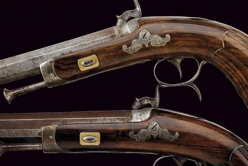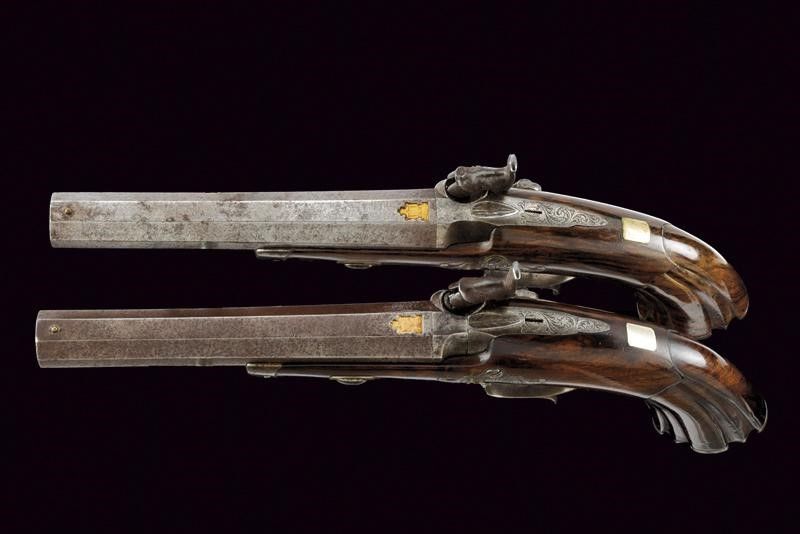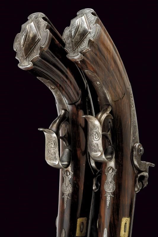 Italia meridionale, lunghezza 31.5 cm. Canne ottagonali lisce, con punzoni di Mazza rimessi in oro alla base, mirino, cal. 17 mm. Codette incise e dotate di traguardo. Batterie a luminello a molla indietro con cartella firmata 'MAZZA' e leggermente incise a motivi floreali. Mezze casse in radica con calcio lievemente scanalato. Fornimenti incisi, ponticelli con poggiadito, cocce con porta capsule, dorsi con scudetto rettangolare in argento. Bacchette in ferro. Meccanica funzionante.
