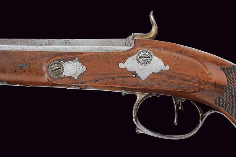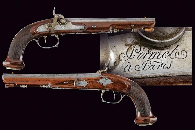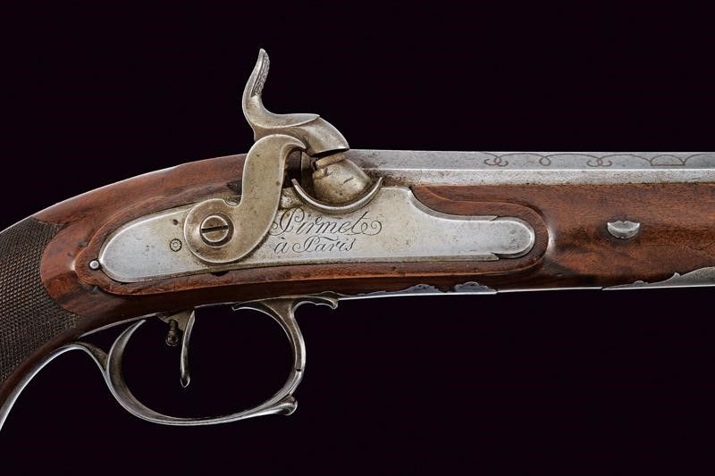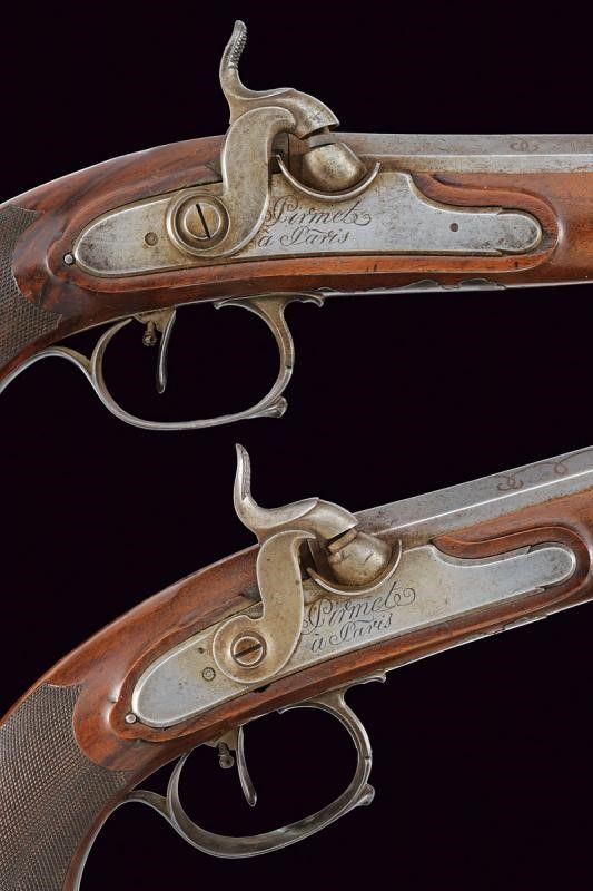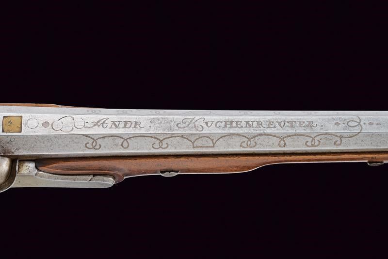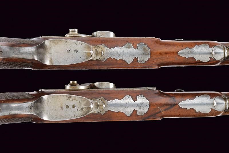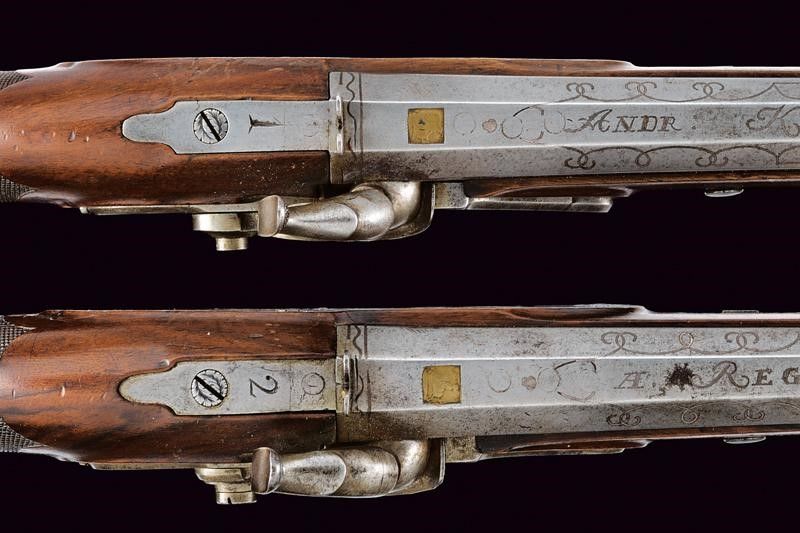 Canne di epoca anteriore, lisce, ottagonali, con mirino alla base, marchi rimessi in ottone (una mostra ancora il tipico cavallo della dinastia Kuchenreuther); su una canna firma in argento 'ANDR. KUCHENREUTER' fra ghirlande, sull'altra 'A. REGENSPURG' con la stessa decorazione; mirini in ottone, cal. 12 mm. Codette marcate '1' e '2'. Batterie a molla in avanti firmate 'Pirmet Ă Paris'. Casse intere in legno con calcio zigrinato e coccia ottagonale, fornimenti lisci in ferro, i ponticelli con due fori (probabilmente per fissare un poggiadito). Grilletti con sensibilizzatore. Meccaniche funzionanti, un sensibilizzatore non tiene, da regolare. Bacchette in legno con battipalla in corno e cavastracci in ottone.