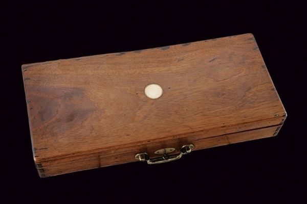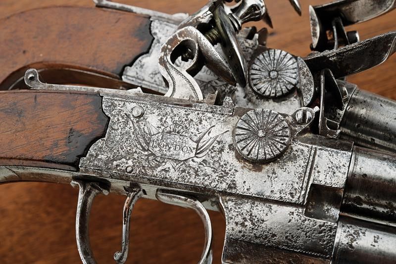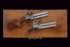 Londra, lunghezza 25.7 cm. Canne rigate (anime pulite, rigatura ben visibile, una in condizioni migliori dell'altra), sovrapposte, tonde, incise alla volata, cal. 13 mm; castelli firmati 'WHEELER' e 'LONDON', incisi a trofei. Zone con danni da ruggine. Cani dorsali muniti di sicura. Sul lato sinistro selettore di canna. Calci in legno. In una cassetta di legno rifoderata internamente in velluto verde e munita di diversi attrezzi. Completa di chiave.
