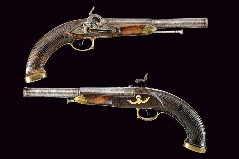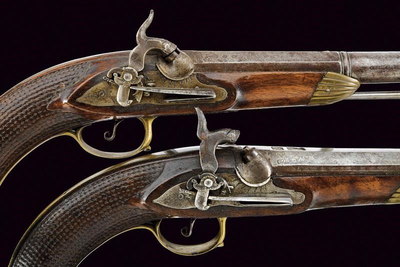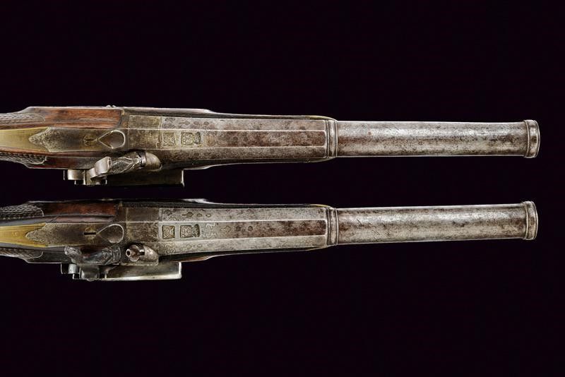 Napoli, lunghezza 39 cm. Canne lisce a due ordini, prima ottagonali con due punzoni fra decorazioni in argento, poi tonde, con anellatura al cambio e con gioia di bocca, cal. 16 mm. Codette dotate di traguardo, batterie alla micheletta con sobrie incisioni. Mezze casse in legno con calcio zigrinato e fornimenti in ottone, i bocchini a conchiglia. Bacchette in ferro. Meccanismi da rivedere.