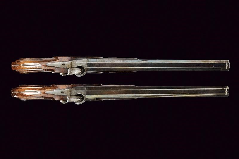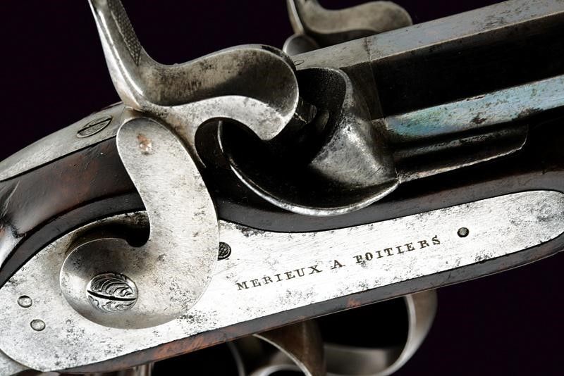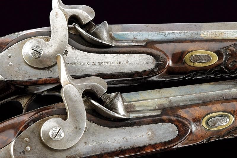 Francia, lunghezza 45 cm. Lunghe canne ottagonali, rigate e brunite (anima pulita, rigatura ben visibile), con culatta numerata '1' e '2', dotate di mirino di precisione, cal. 12 mm. Codette lisce numerate e munite di alzo. Batterie a molla in avanti con cartella firmata 'MERIEUX A POITIERS'. Mezze casse in legno con muso scolpito a fiorami e calcio con scanalature che seguono la curvatura. Fornimenti in ferro, ponticelli con poggiadito, coccie terminanti a trottola. Meccanica funzionate.
