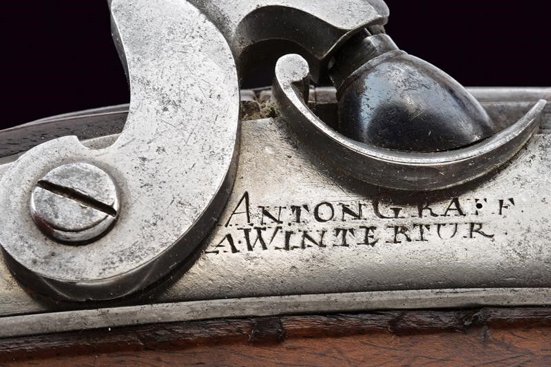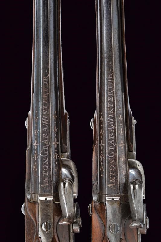 Canne rigate (anime pulite, rigatura ben visibile), tonde, con base quadra, firmate in argento 'ANTON GRAF. A WINTERTUR' fra decorazioni floreali su base brunita, mirino a coda di rondine in argento, cal. 11 mm; codette con alzo. Batterie ridotte a luminello firmate en suite. Casse intere in legno con fornimenti in argento. Bacchette in legno con battipalla in corno.