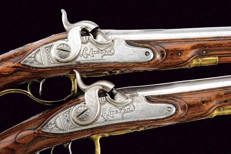 Europa del Nord, lunghezza 35.5 cm. Canne tonde lisce, con basi leggermente incise, sezione che diminuisce verso la volata, mirino, cal. 13 mm. Codette incise e dotate di traguardo. Batterie convertite a luminello con cartella firmata 'L. LIDBERG' e con codoli leggermente incisi ed intagliati. Casse in legno con fornimenti in ottone, ponticelli strutturati a motivi floreali (in una pistola mancanze), cocce intagliate a fiore. Bacchette in legno con base in ottone e battipalla in corno.