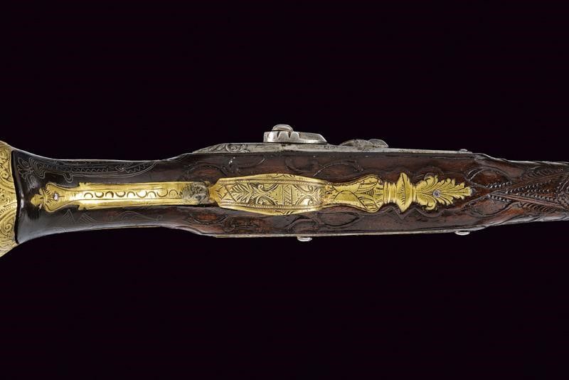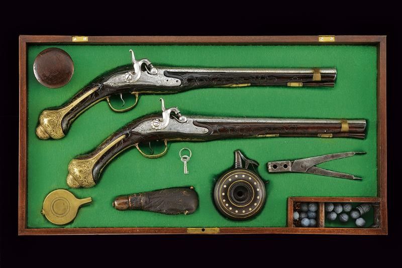 Prima metà del XIX Secolo Canne lisce, tonde con base quadra, con bindella, incise a motivi floreali, cal. 15 mm; codette incise e munite di traguardo; batterie a molla in avanti, ridotte a luminello, incise ed intagliate. Casse intere in legno scolpito e con intarsi in filigrana. Bei fornimenti in ottone decorato a motivi floreali in bassorilievo. Bacchette (finte) in legno con fornimenti in corno. Piccoli difetti e mancanze. In una cassetta non pertinente munita di una fiasca da polvere tedesca, un dispensatore di capsule, ed una fondipalle, nel coperchio una placca ovale formato da monete incollate del XIX secolo.