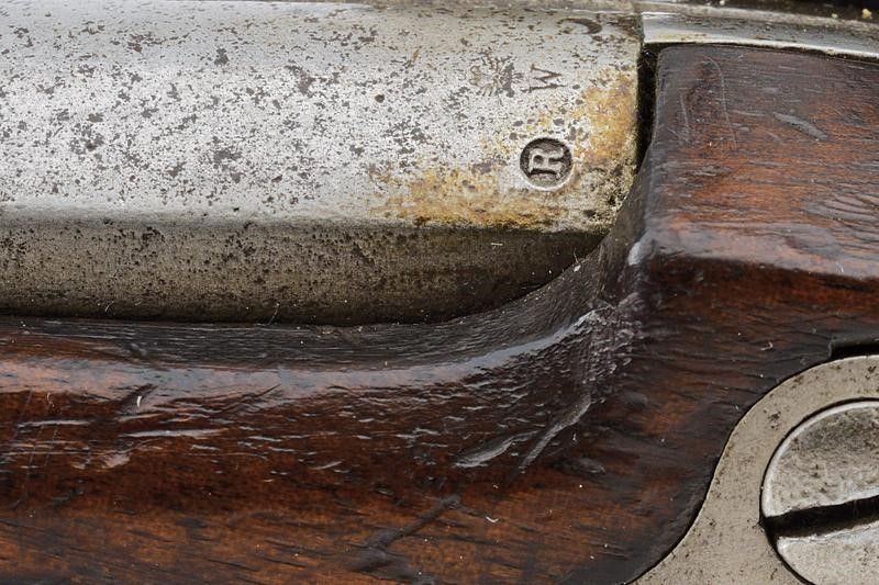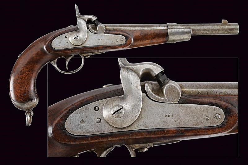 Canna tonda rigata con base quadra e scanalata, avente punzoni 'R' e 'W, mirino, cal. 13. 9 mm. Batteria datata '863' e con punzone imperiale. Cassa in legno con fornimenti e anello di sospensione in ferro.