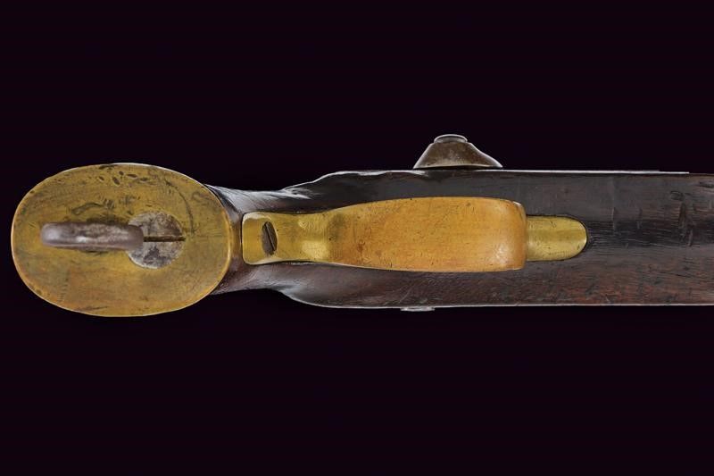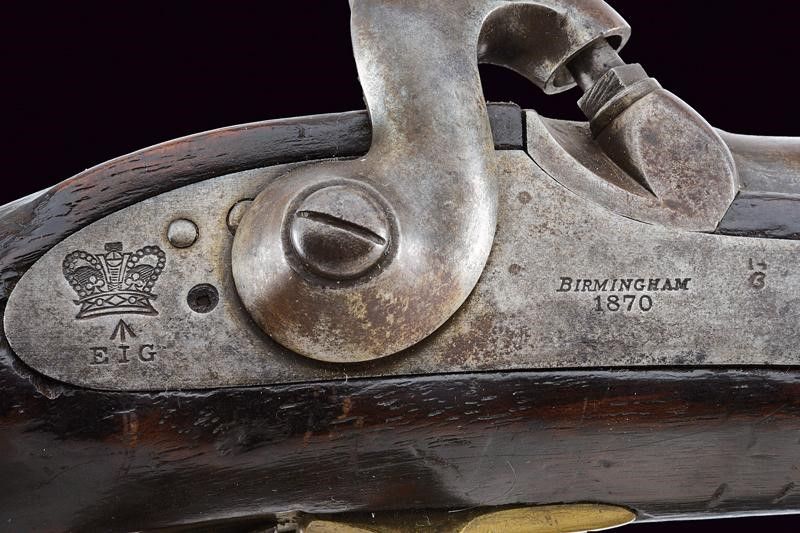 Birmingham, lunghezza 36 cm. Canna tonda liscia, con breve bindella alla base recante vari punzoni; mirino, cal. 15 mm. Codetta con alzo. Batteria a molla in avanti marcata 'EIG' sotto corona e '1870 BIRMINGHAM'. Cassa intera in legno con timbro 'WD' e 'ISAAK HOLLIS SONS'. Fornimenti in ottone, la bacchetta a snodo e l'anello di sospensione in ferro.