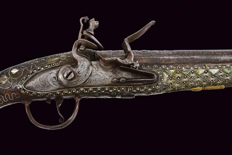 Turchia, lunghezza 47,5 cm. Prima metà del XIX Secolo Canna in ferro liscia, tonda, con volata leggermente strombata e con intagli floreali alla base e una bindella che si abbassa progressivamente verso la volata; la culatta con anellature e resti di incisioni. Cal. 16 mm. Codolo con traguardo a sella. Batteria a pietra (produzione eruopea settecentesca?) con cartella tondeggiante recante resti di intagli a racemi. Meccanica dura ma funzionante. Cassa in legno di produzione orientale con tipica bacchetta finta integrata. La superficie riccamente ornata con agemine in metallo color argento a motivi geometrici, alternate a tarsie in madreperla. Ponticello in ferro. Coccia in ottone con mascherone e fiorami. Contropiastra in ottone con decoro floreale. Scudetto dorsale in ferro con intaglio (forse a caratteri islamici).