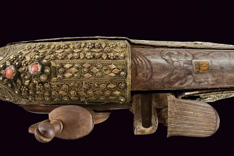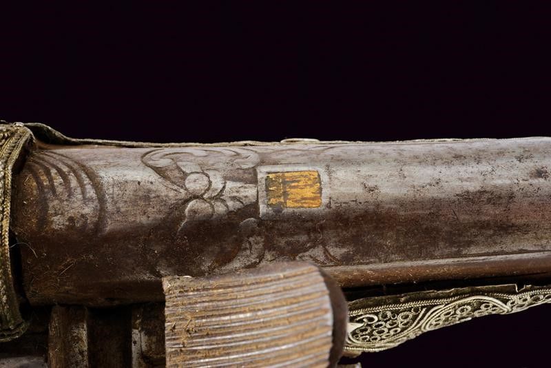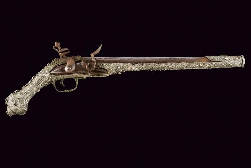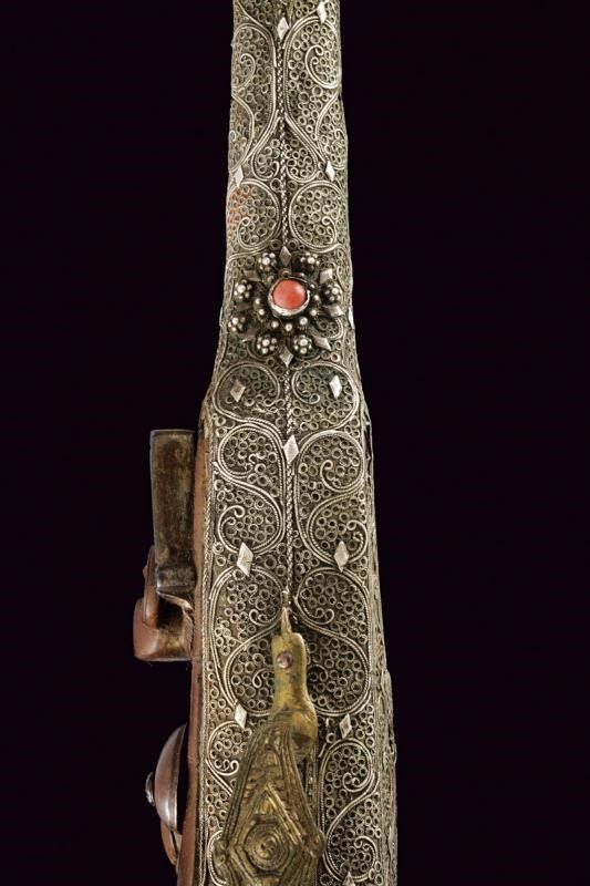 Turchia, lunghezza 54.5 cm. Prima metà del XIX Secolo Lunga canna liscia tonda, con base quadra, leggermente intagliata e con una marca in ottone, dotata di bindella, cal. 15 mm. Batteria a pietra focaia (meccanica da rivedere, traballante). La cassa completamente rivestita con lamina d'argento finemente decorato in filigrana; sotto alla canna una pietra rossa a cabochon. Piccoli difetti e mancanze.