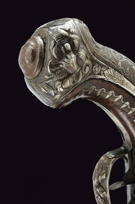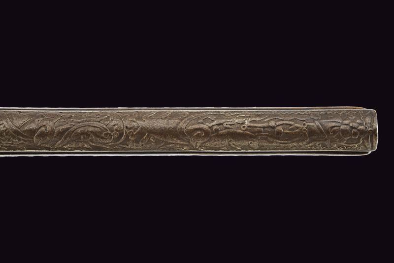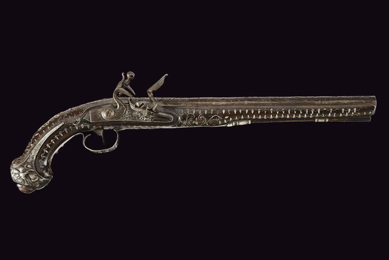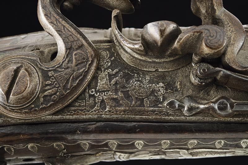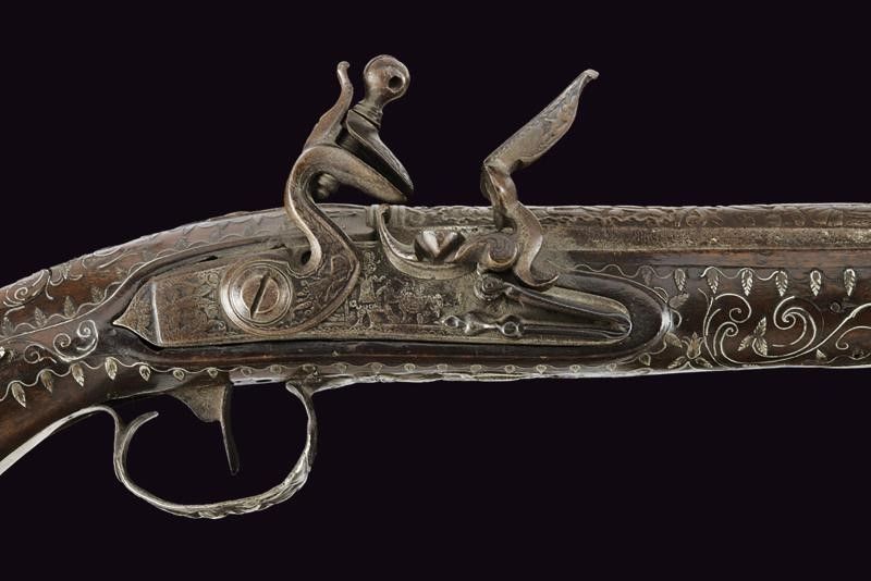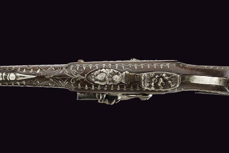 Francia, lunghezza 47.5 cm. 1800 circa Canna tonda, liscia, riccamente intagliata con effigi di animali e figure grottesche fra decori floreali, codetta con bordo delineato. Batteria a pietra focaia finemente intagliata en suite. Cassa intera in legno riccamente decorata con tarsie in filigrana a motivi floreali in argento. Fornimenti in argento incisi a trofei e a motivi floreali. Bacchetta finta in legno.