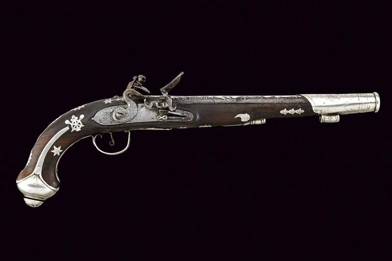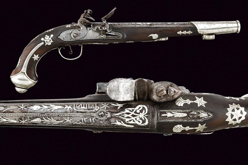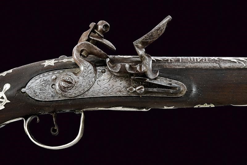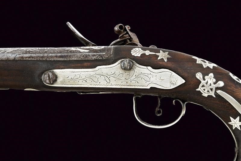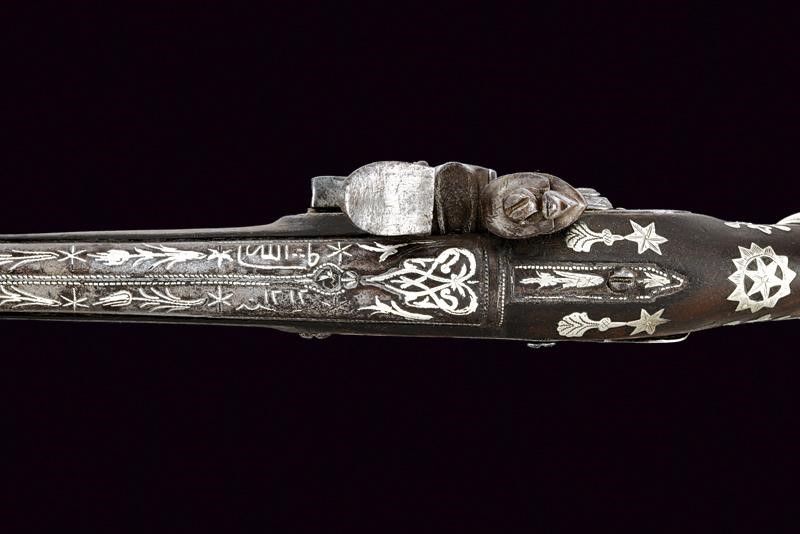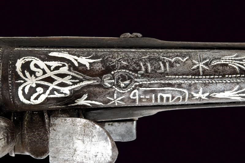 Impero Ottomano, lunghezza 42,5 cm. Metà del XIX Secolo Canna tonda liscia, riccamente ageminata in argento al dorso con decori floreali, recante un punzone sul fianco sinistro, cal. 15,5 mm. in volata. Batteria di gusto europeo con decorazione ad imitare una firma e recante cornicette e fiorami. Meccanica funzionante. Cassa in legno con lieve mancanza sul lato inferiore. Fornimenti in argento. Il ponticello inciso a fiorami e punzonato. Anche la coccia in argento, con resti di un punzone, come anche la contropiastra e il tipico lungo bocchino. Bacchetta mancante. Segni d'uso e del tempo.