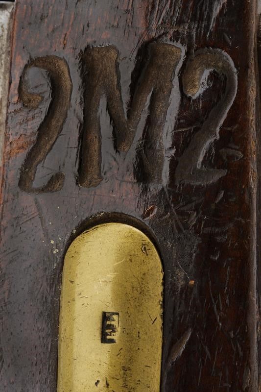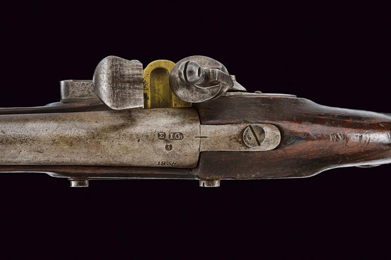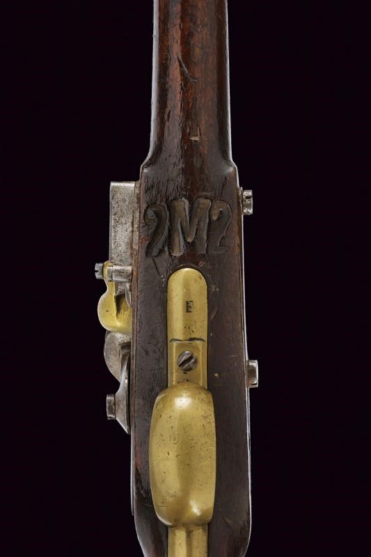 Canna liscia tonda, con base quadra, marcata e datata 'I.G:', 'M' e '1834', cal. 17 mm. Batteria a pietra focaia con firma della manifattura di Brescia e con scodellino in ottone. Cassa intera in legno marcata sotto alla batteria '2M2' e con fornimenti in ottone, la contropiastra in ferro. Piccoli difetti.