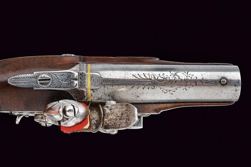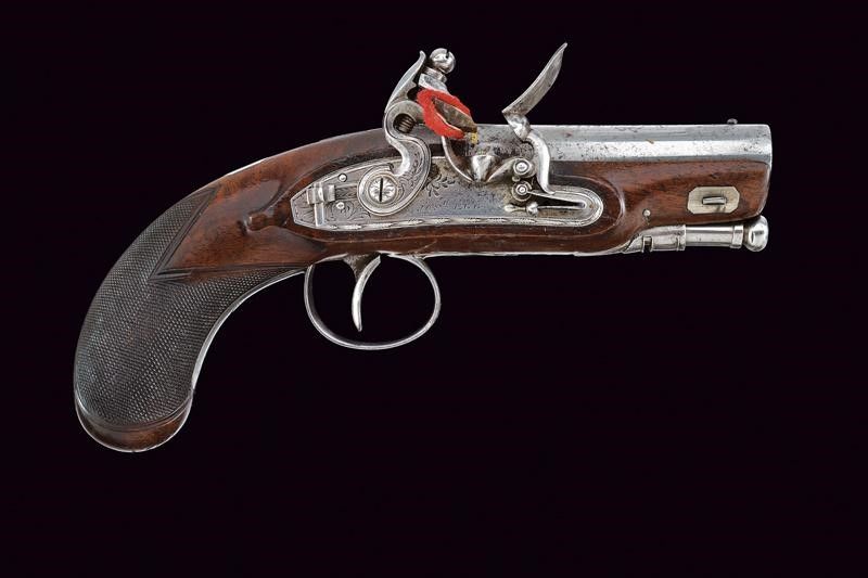 Londra, lunghezza 18 cm. Canna tonda liscia con base quadra e breve bindella, marcata 'LONDON'; la prima parte con cornice e banda in oro, in seguito incisioni a motivi floreali e mirino, cal. 12 mm. Codetta incisa e munita di alzo. Bella batteria a pietra focaia firmata 'JOS.H EGG' ed incisa a motivi floreali, munita di sitema antifrizione, a tenuta stagna e con sicura. Cassa intera in legno con calcio zigrinato, ponticello in ferro inciso, sul dorso scudetto in argento. Bacchetta in ferro.